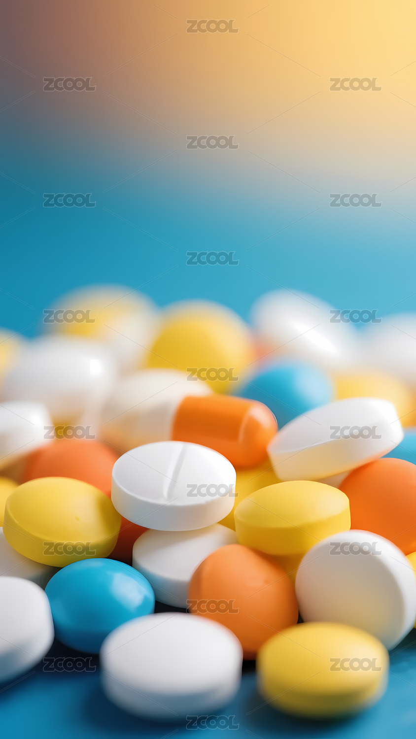色彩,立体,三维,药片,药品,蓝色,白色,黄色,橙色,胶囊