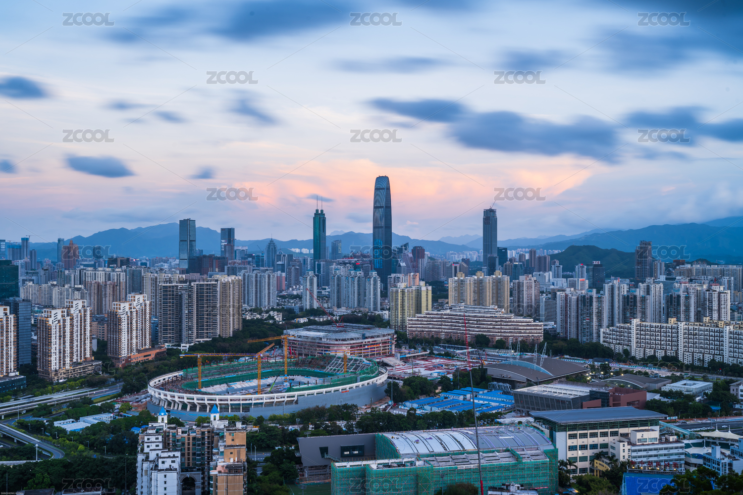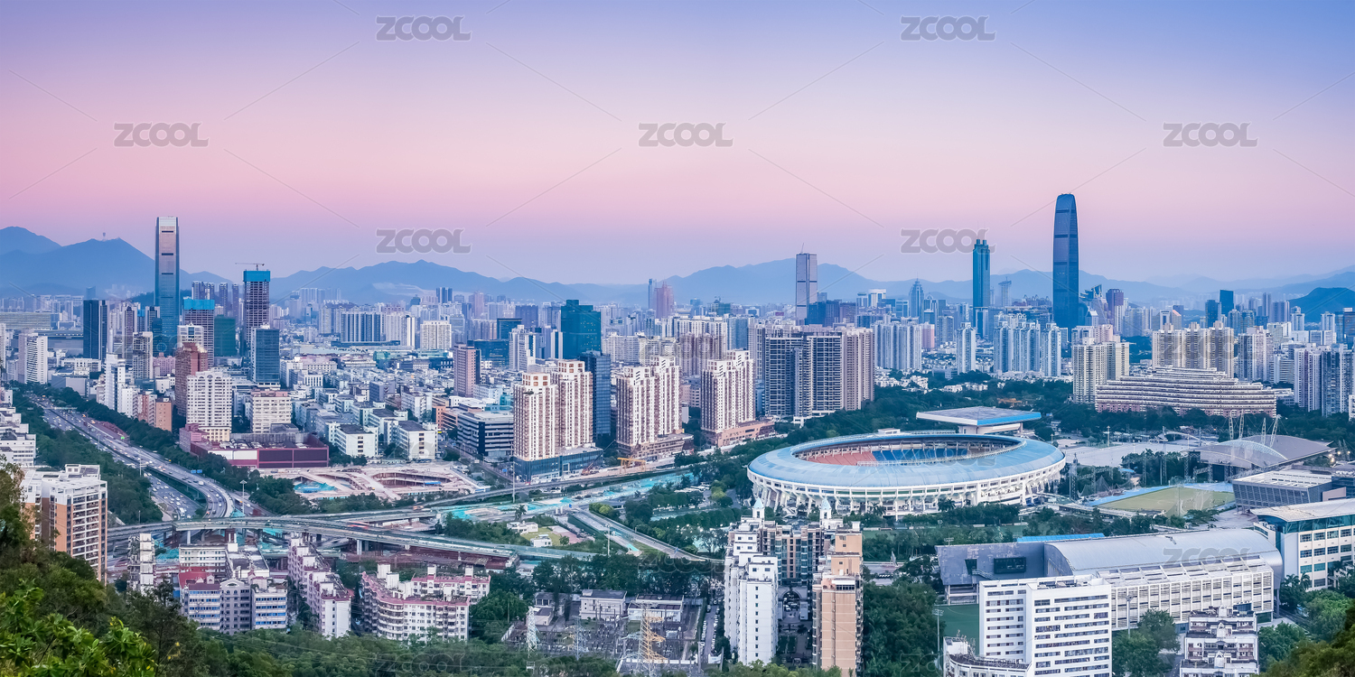 深圳笔架山俯瞰城市高楼建筑夕阳景观