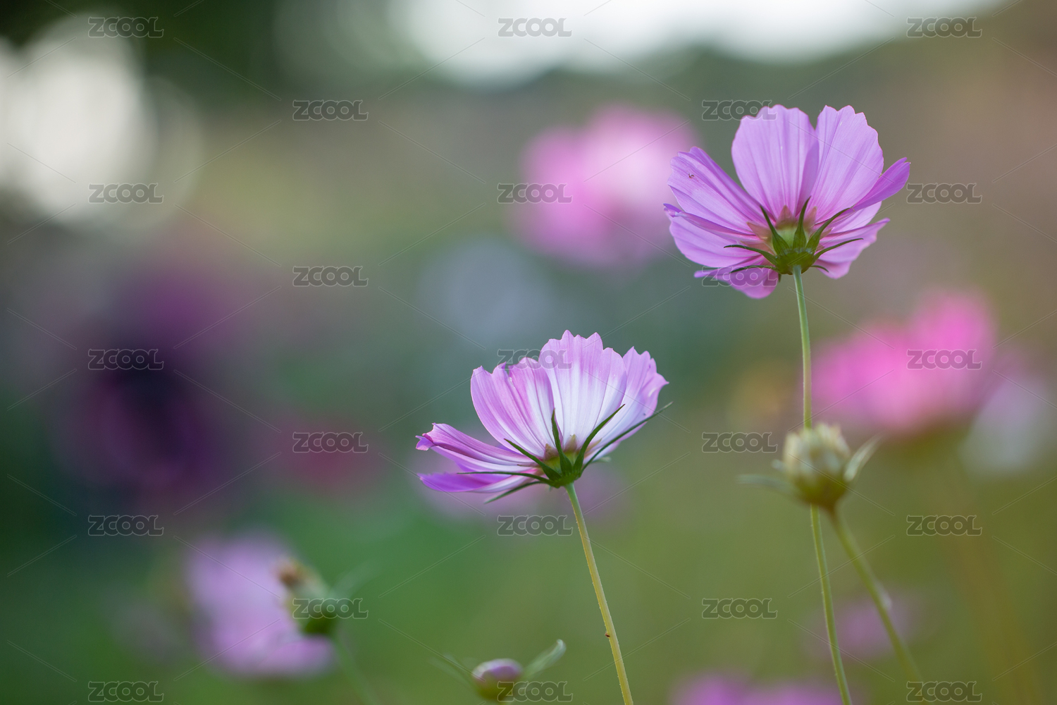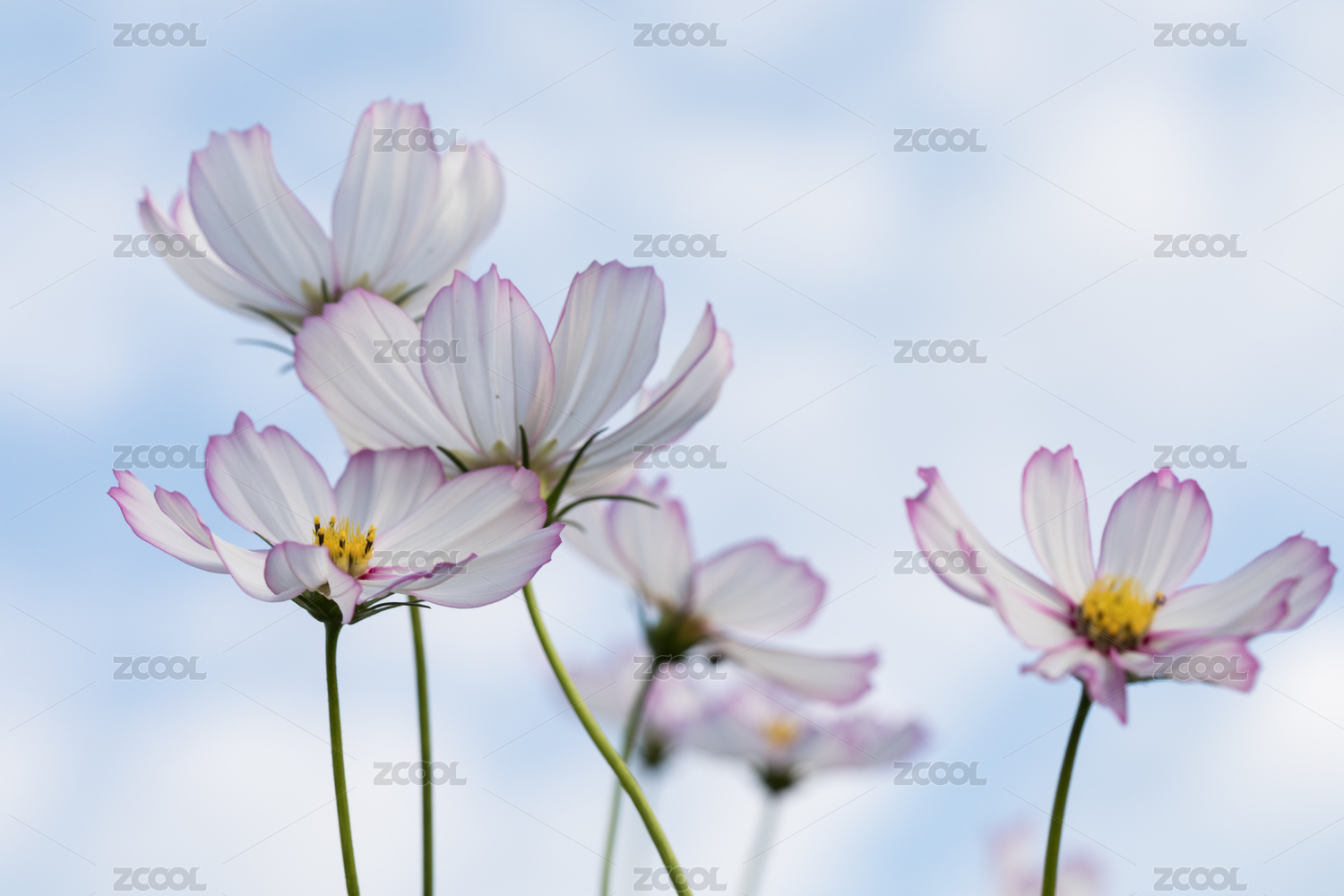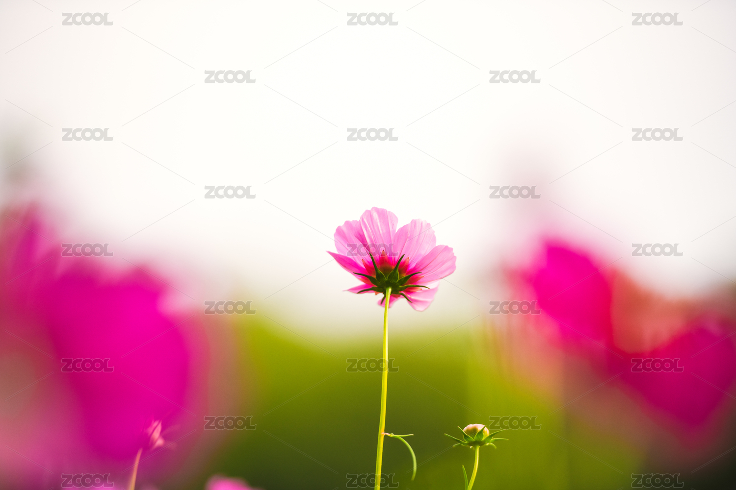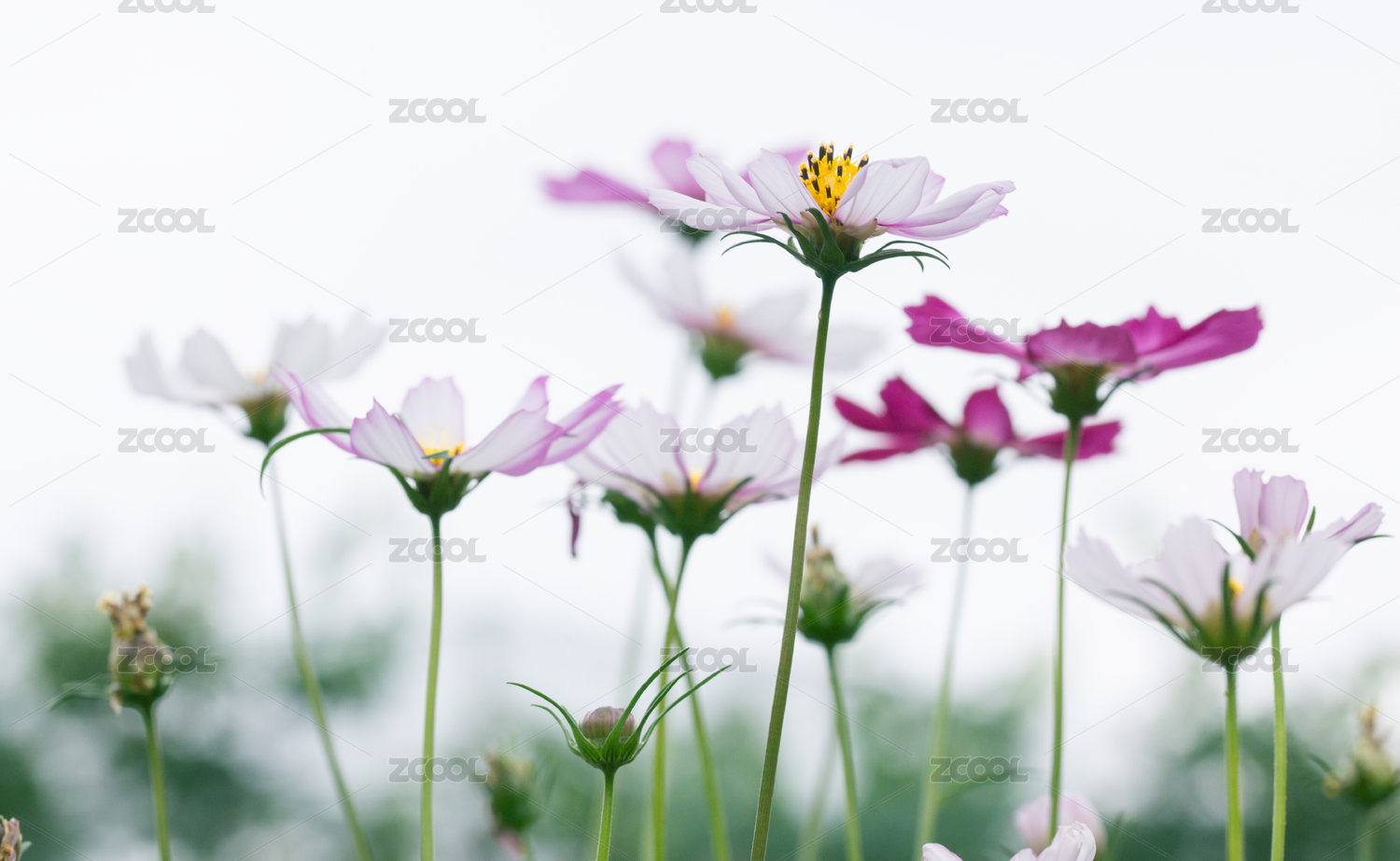 横幅仰拍的以白色天空为背景粉色波斯菊特写