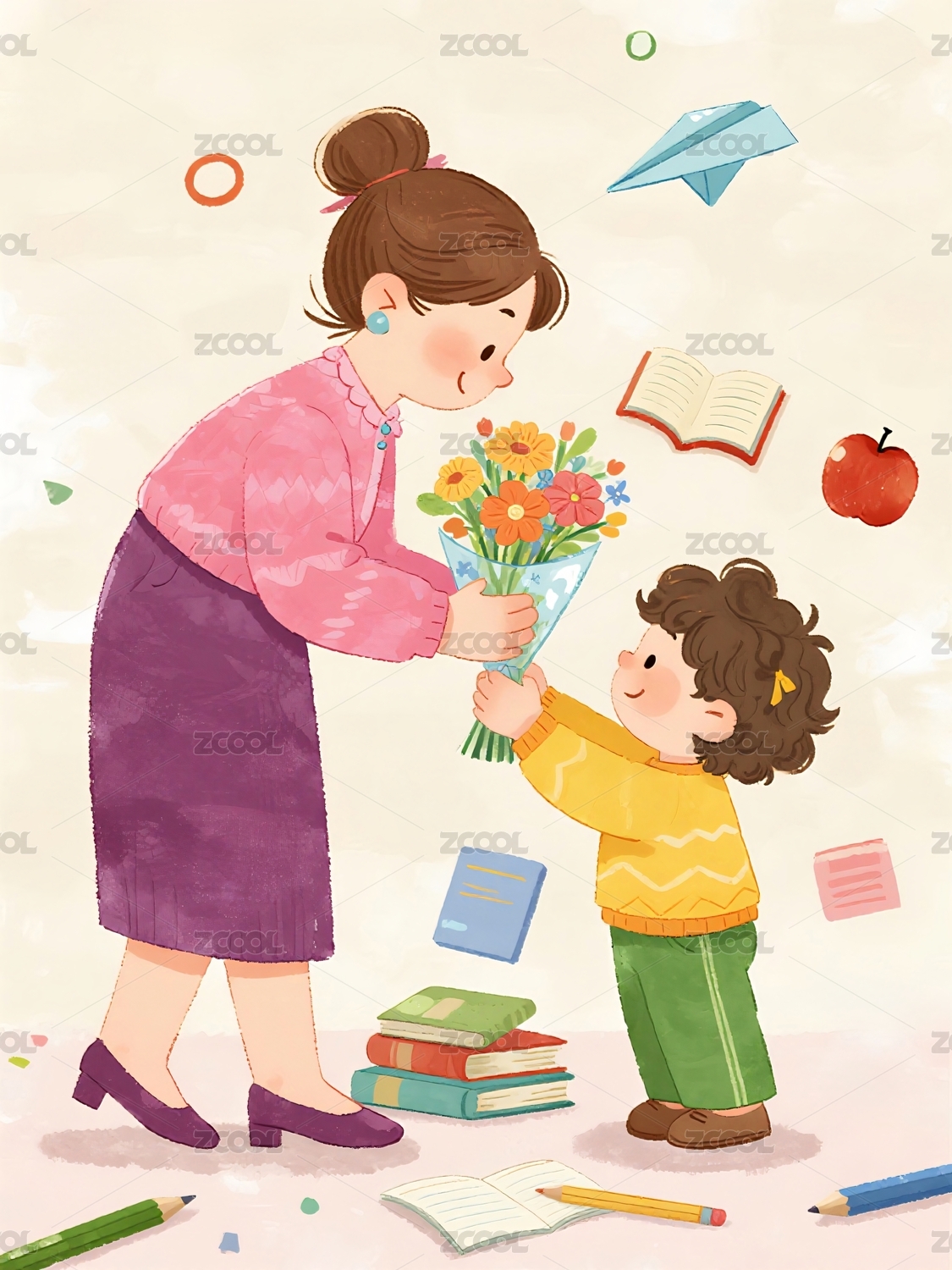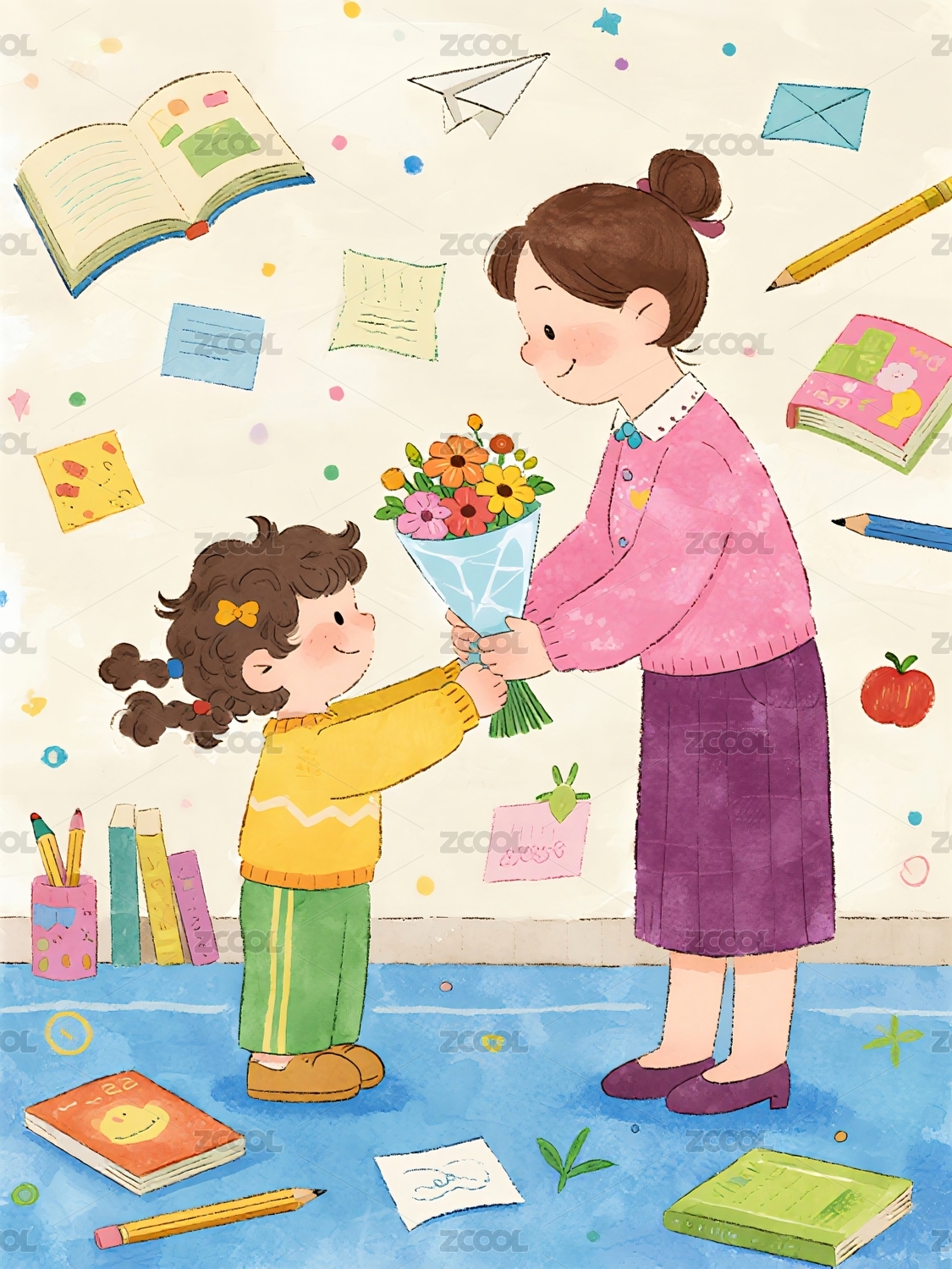小清新风格,教师节,老师,学生,照片,插画,相片,桌面,捧花,书本