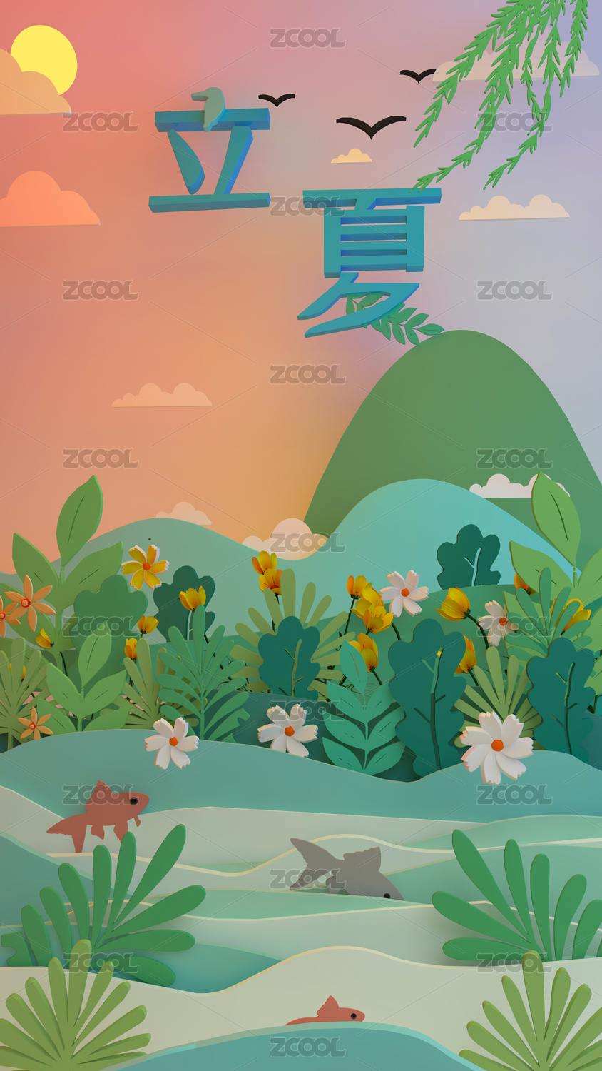 立夏艺术字下一片池塘中盛开着莲花莲叶