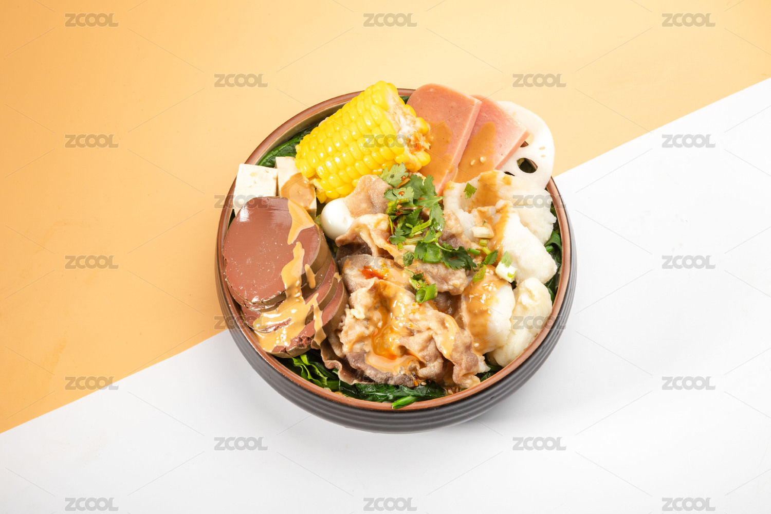 撞色,卡纸,麻辣烫,配菜,涮菜,蓝色盘子,木勺子,菜单,菜谱,羊肉卷