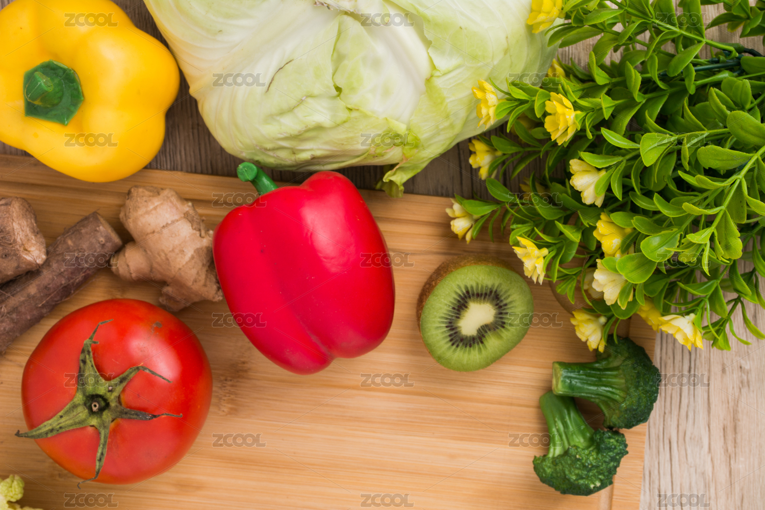 白色背景上围绕着砧板的各类新鲜蔬菜