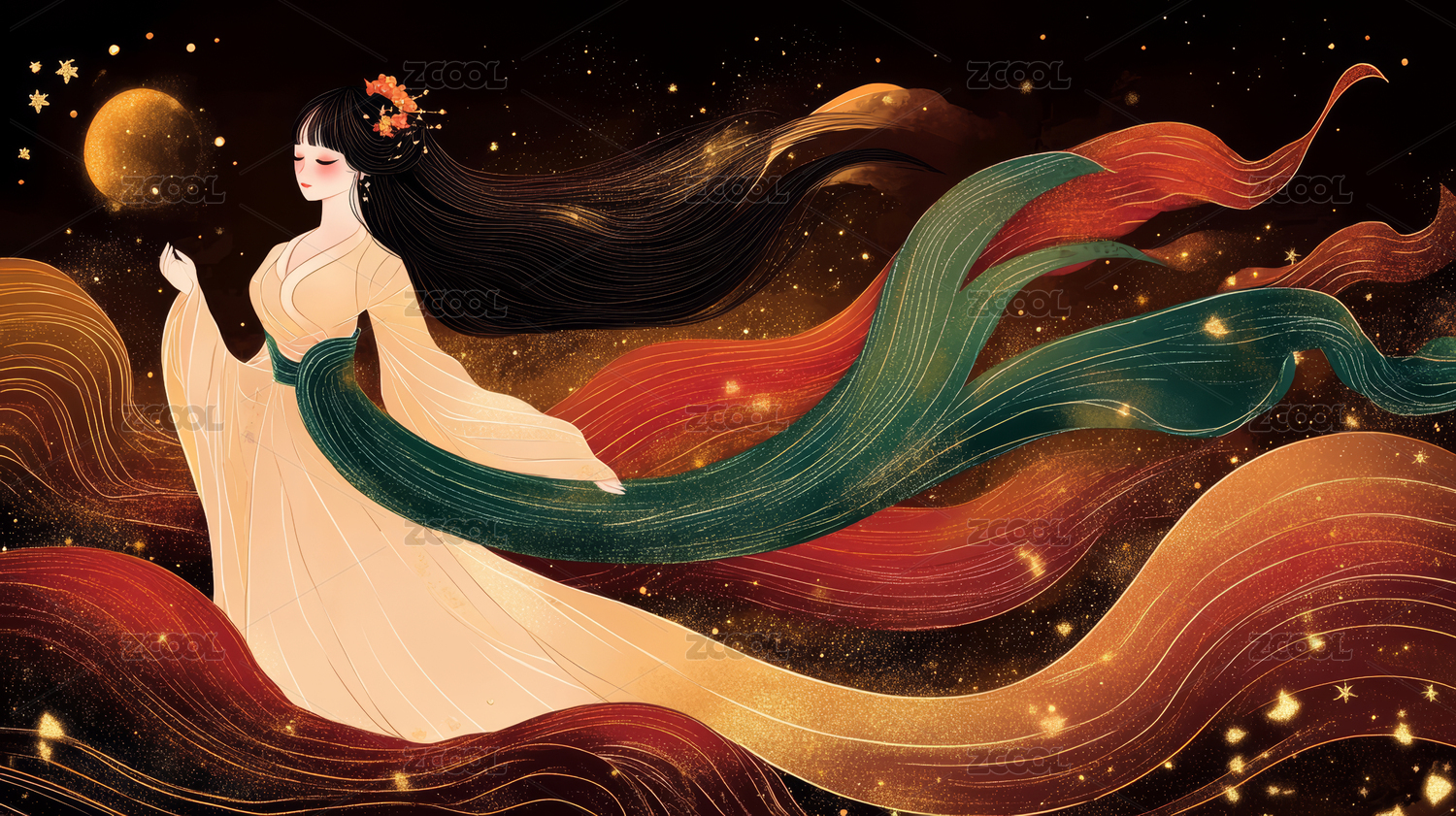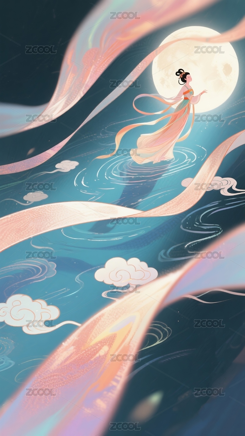 中秋,中秋节,中国风,国潮,国风,古风,嫦娥,飞天仙女,仙女,月亮