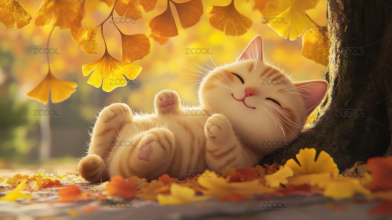 AIGC202401,猫咪,幼崽,橘猫,秋天,树林,落叶,金色,玩耍,阳光