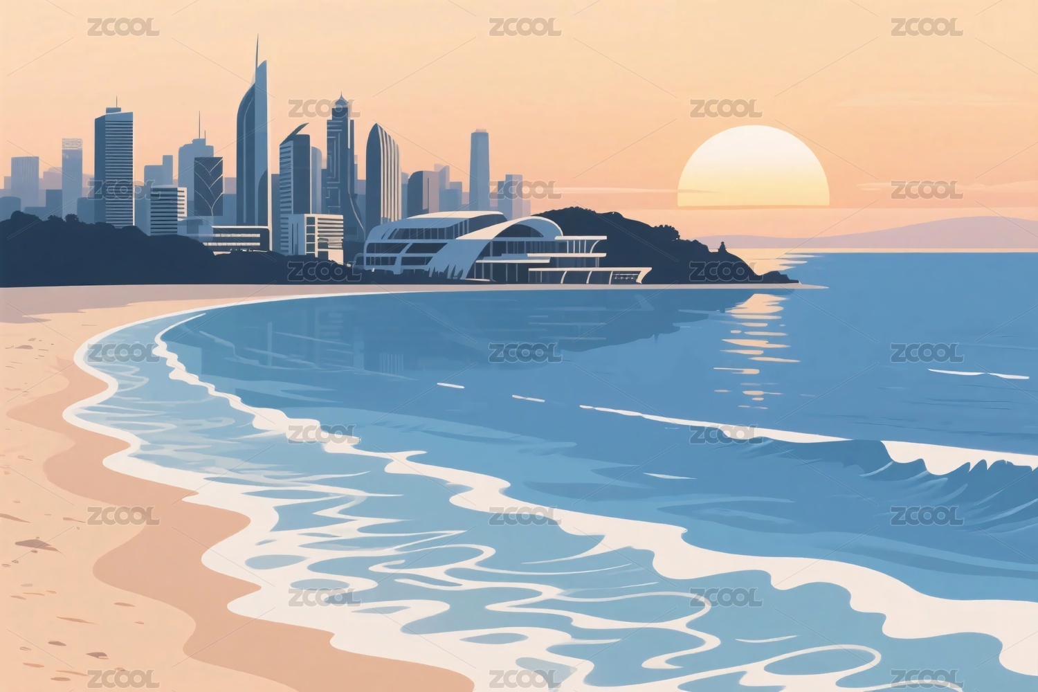 热带现代海滨城市岸边景象涂鸦绘画插画