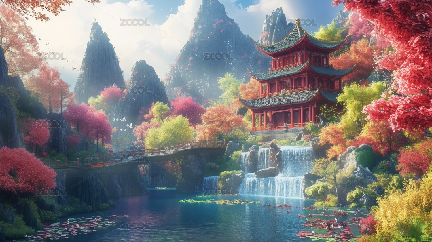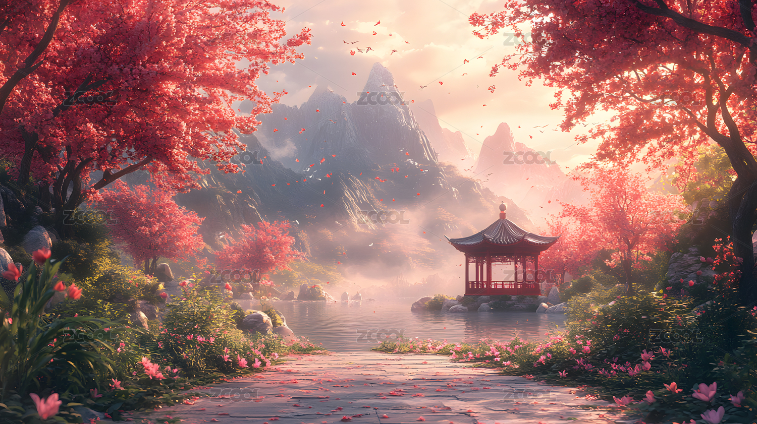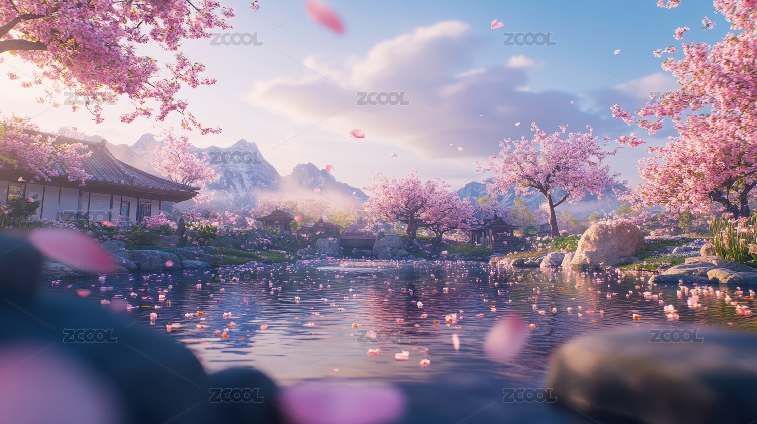梦幻仙境粉色樱花古建筑山水画