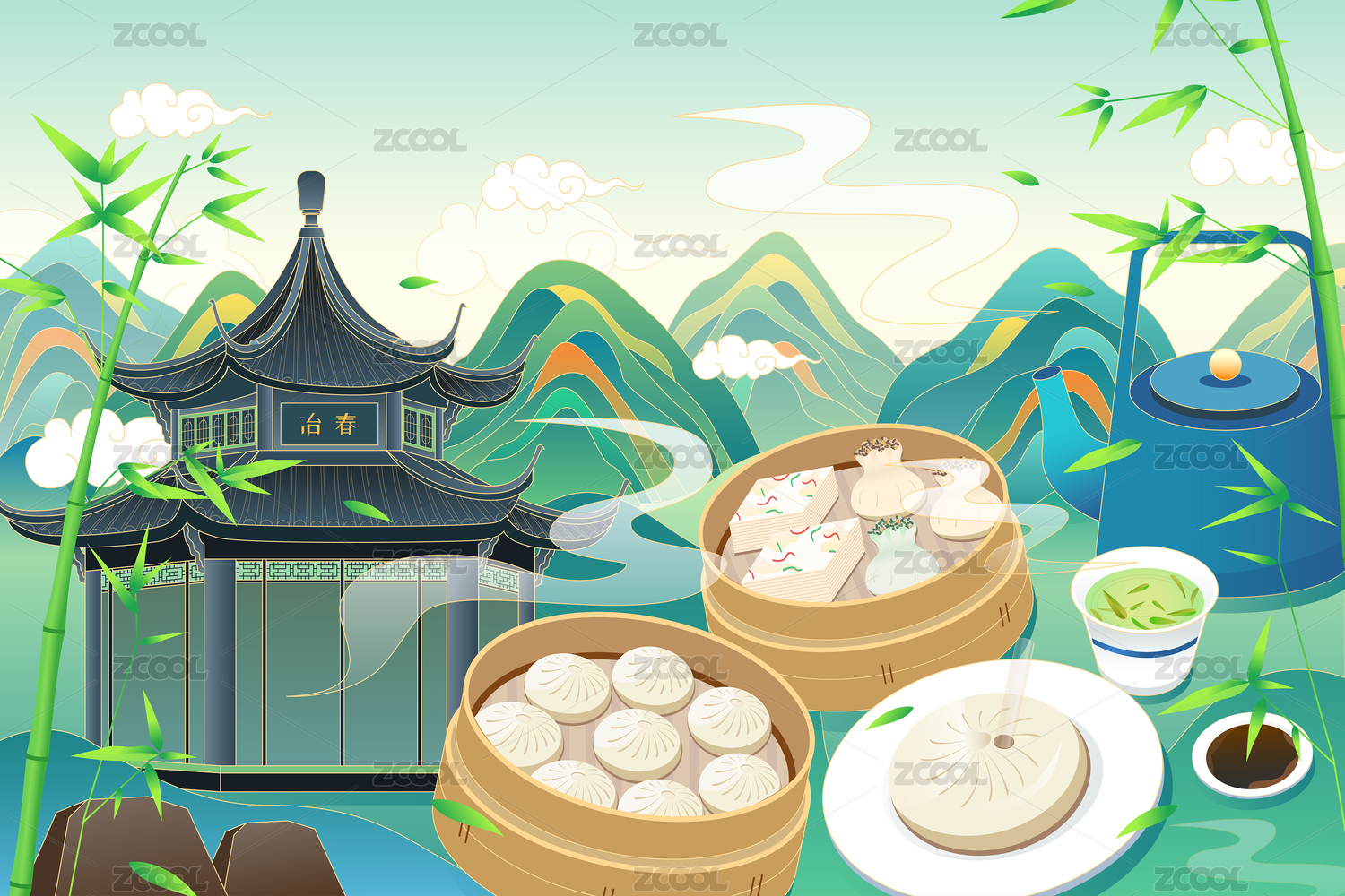 矢量国潮中国风传统美食扬州早茶