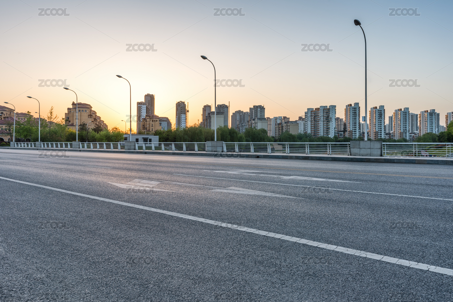 中国杭州空旷的柏油路与现代城市建筑天际线