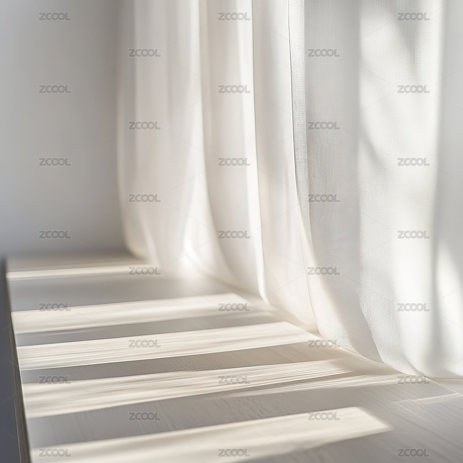 明亮的空房间与穿过窗帘的阳光光,三维渲染