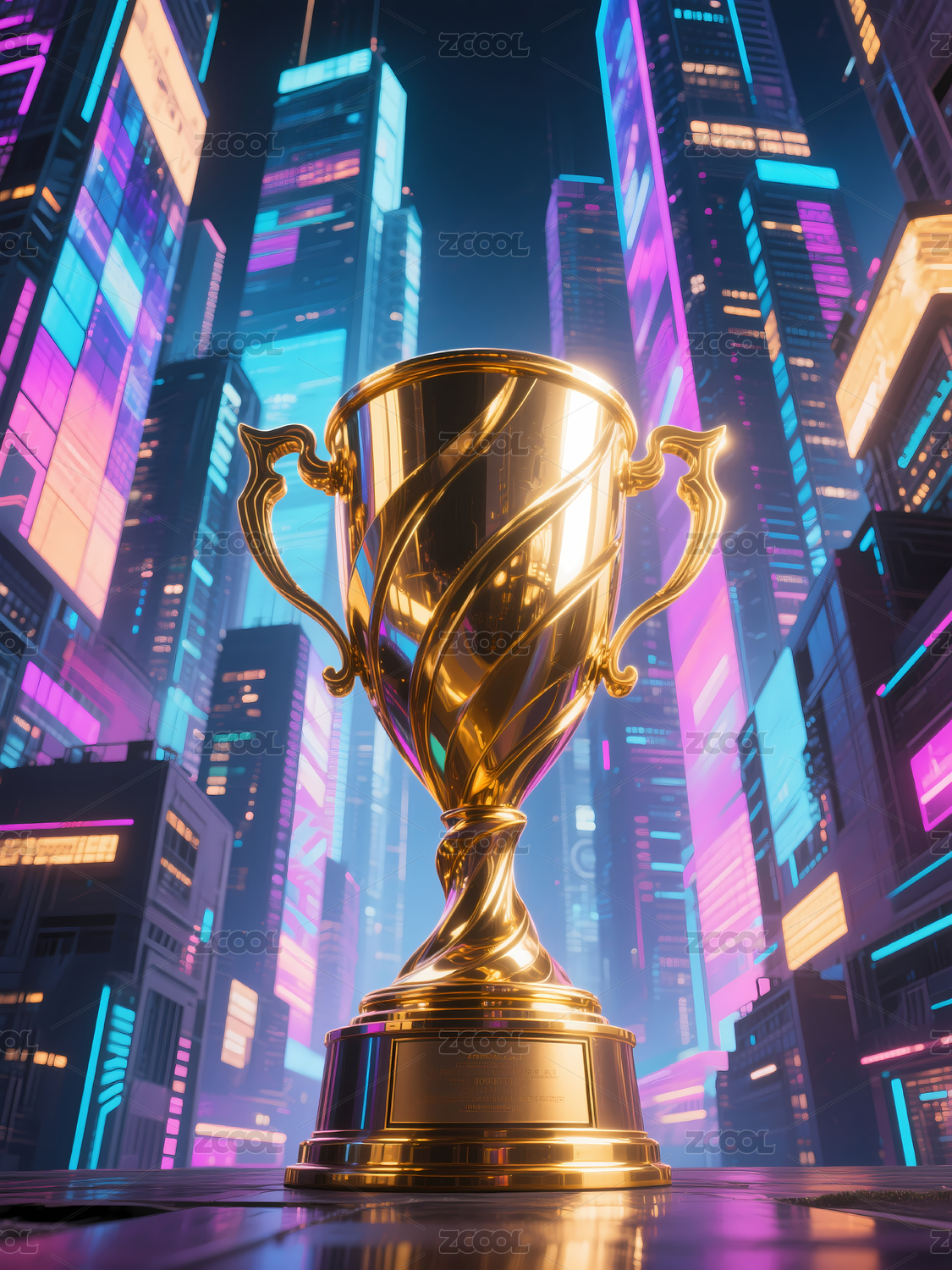 金色奖杯与霓虹城市夜景