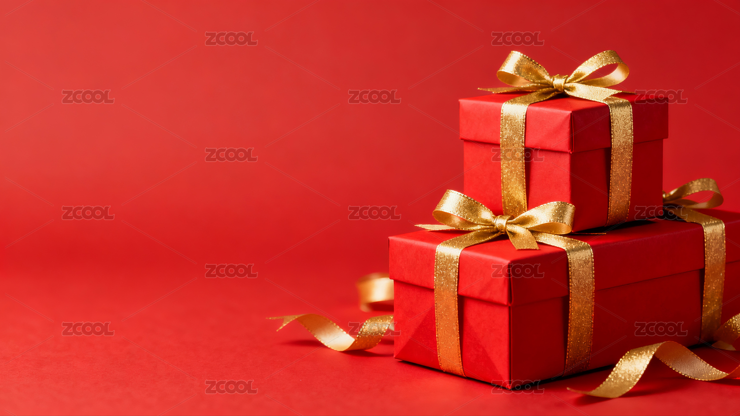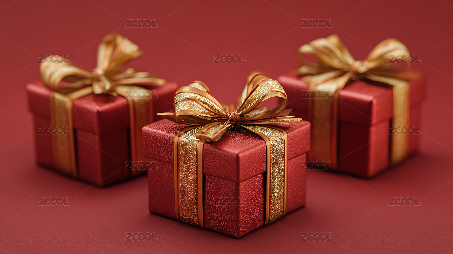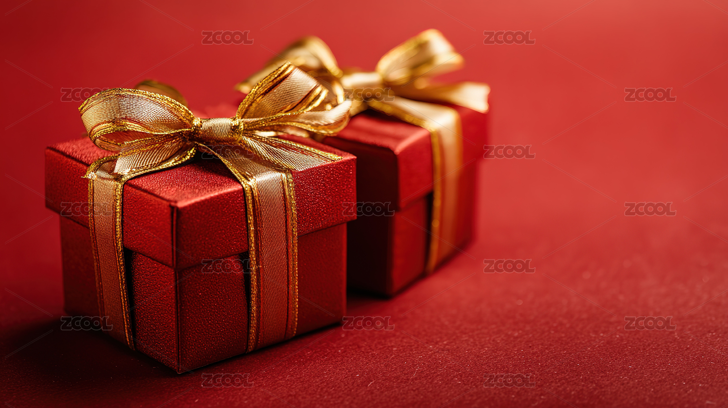 放在红色背景的绑着香槟色带子的红色礼物盒局部