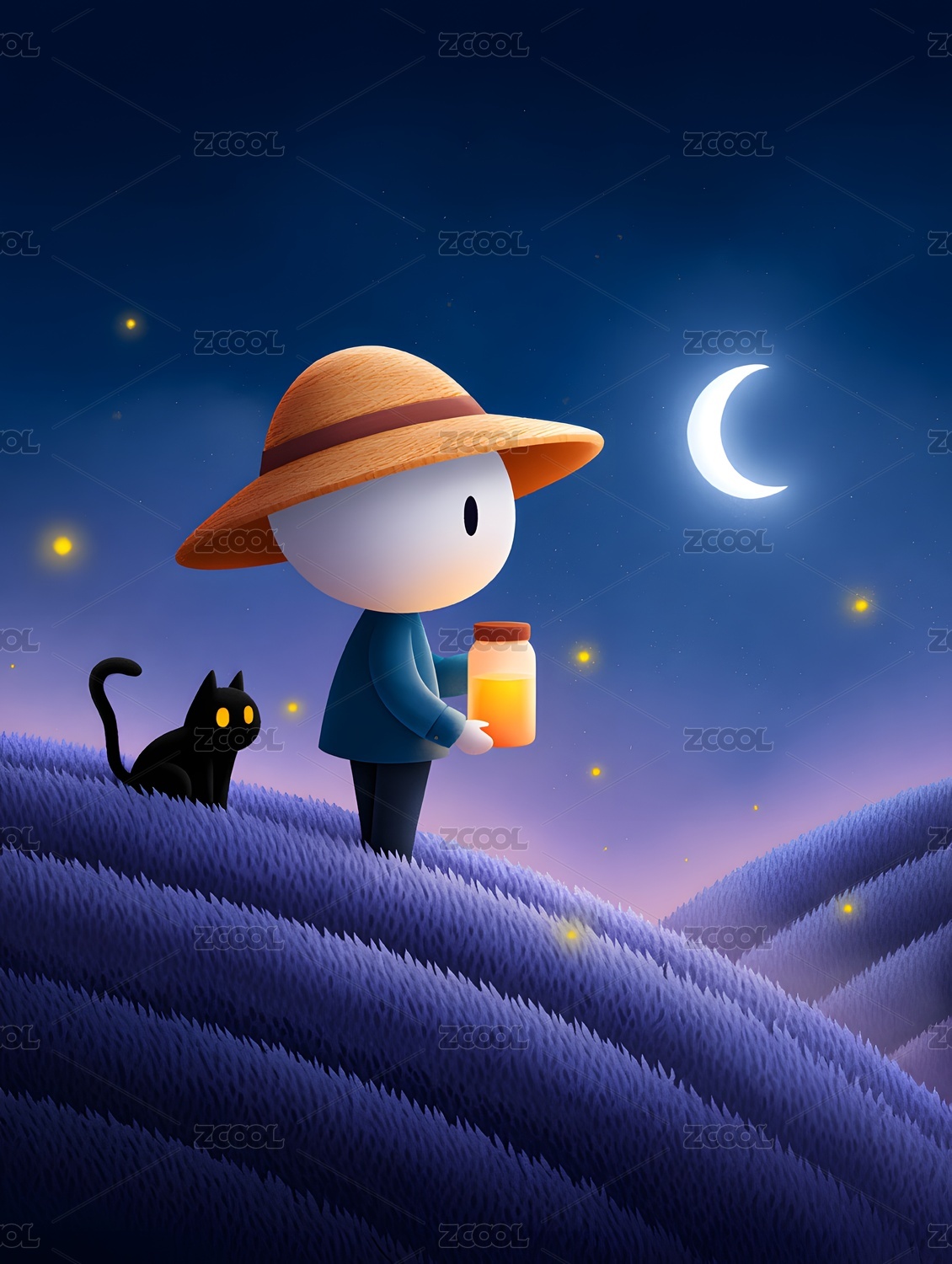 夜晚, 深色, 帽子, 星空, 星星, 月亮, 男子, 简洁, 插画, 卡通