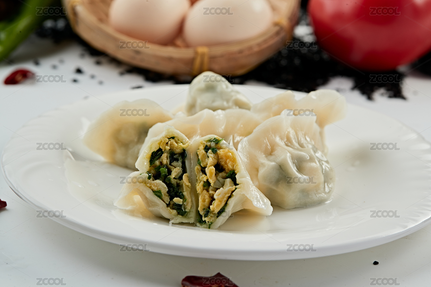 白背景一盘韭菜猪肉煎饺