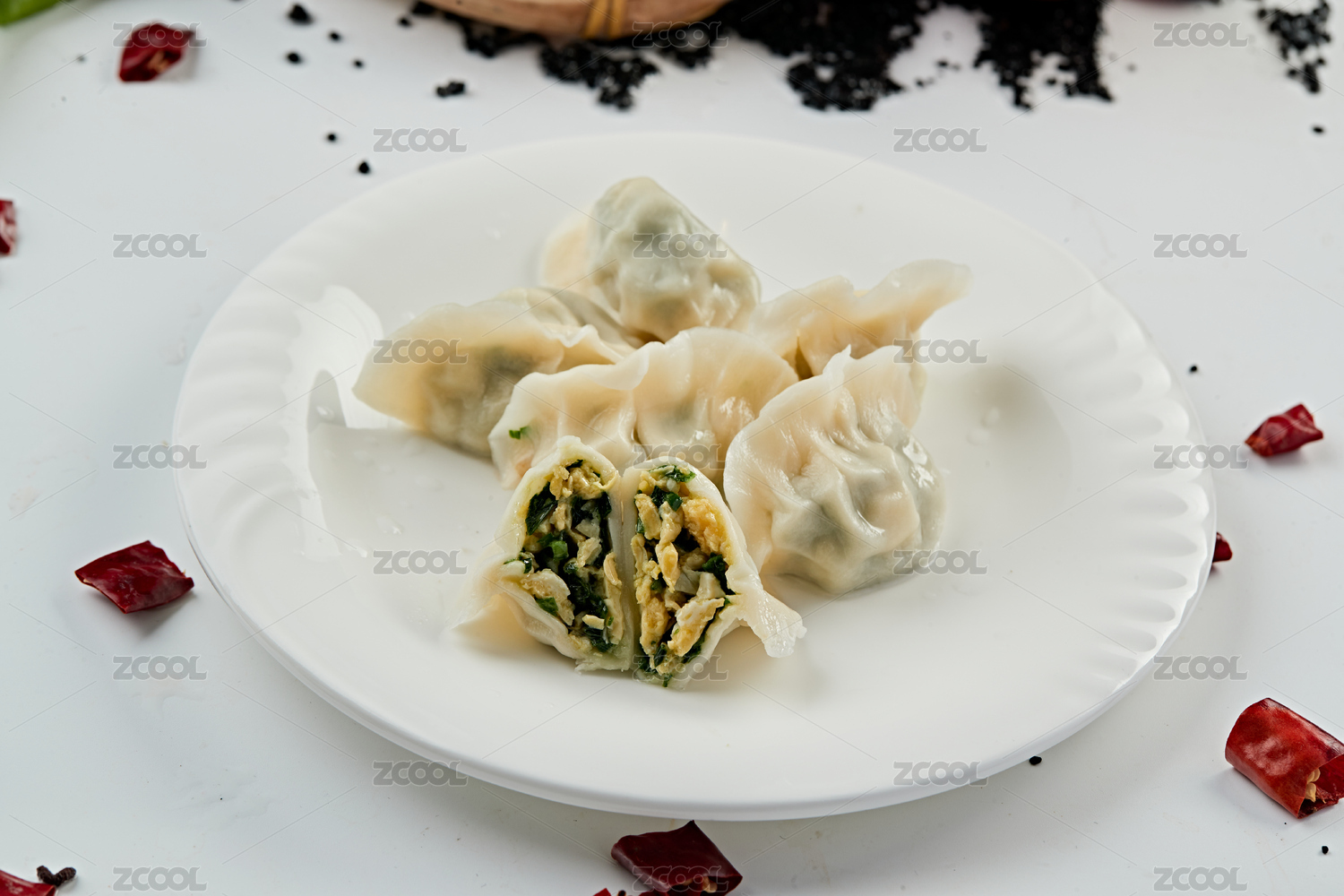 黑背景下白色盘子中的韭菜鸡蛋馅饺子