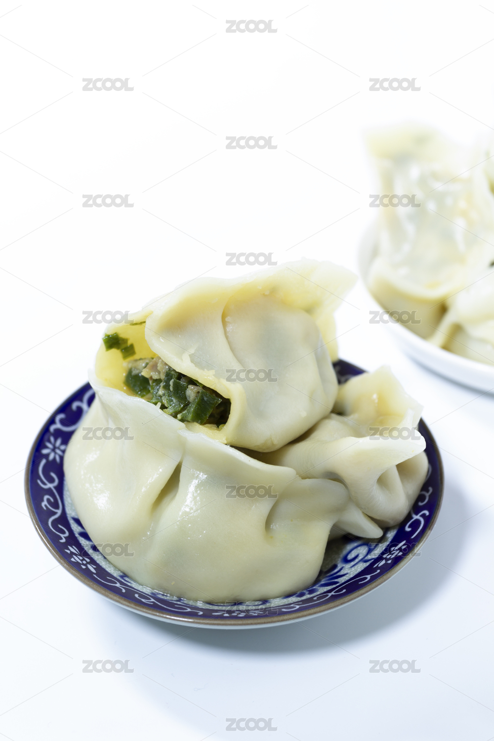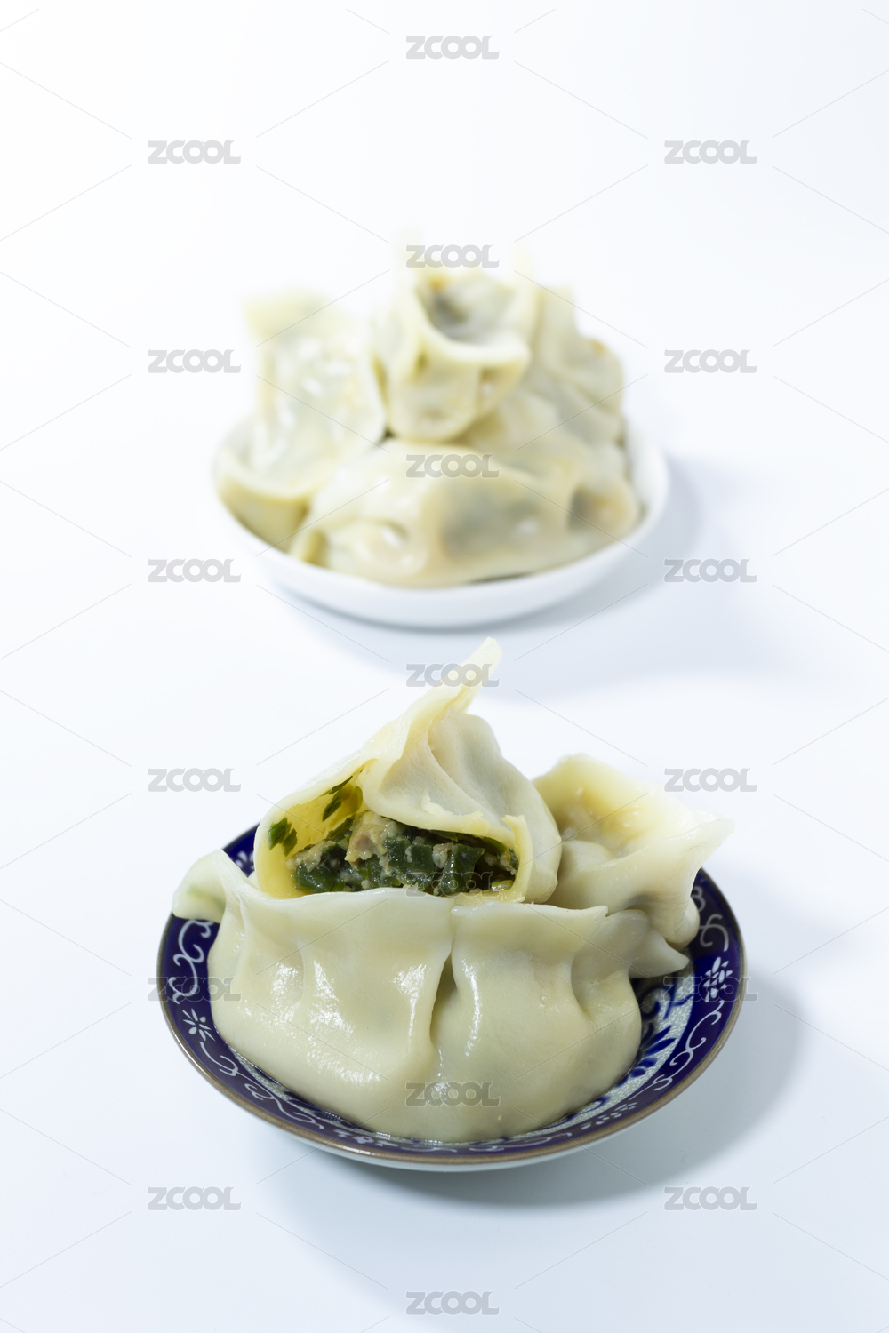 摆放在白色背景上的两碟饺子