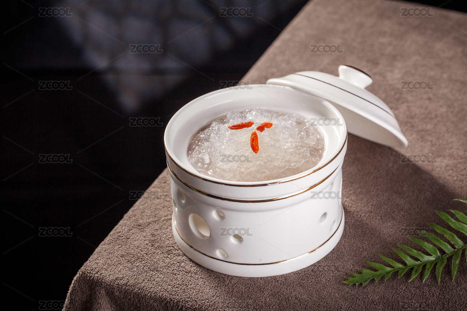浅灰色背景上一个白色瓷盏里的鸡汤鱼肚