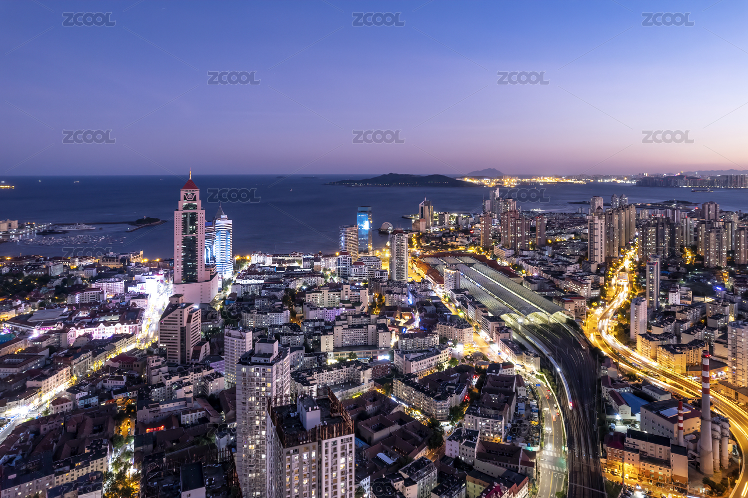 航拍青岛海岸线城市夜景
