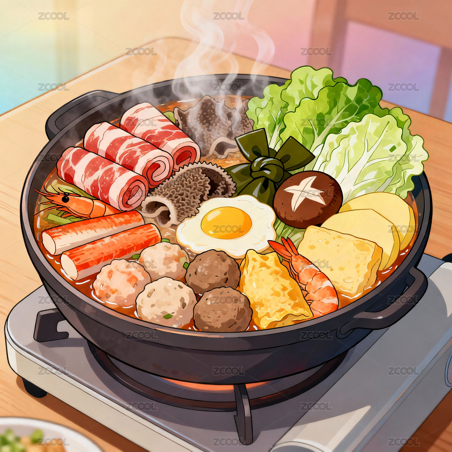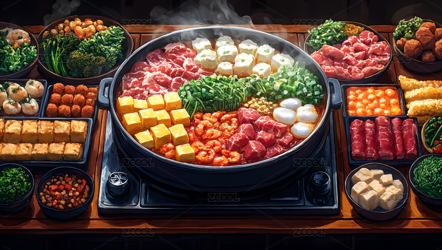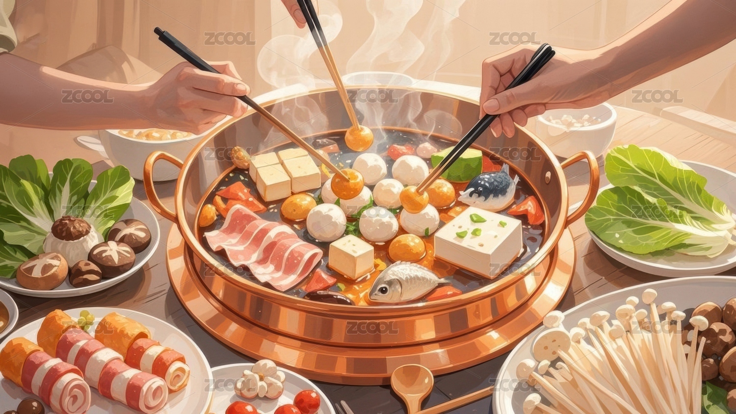 中式,火锅,插画,成都,麻辣,团聚,聚餐,食材,美味,中餐