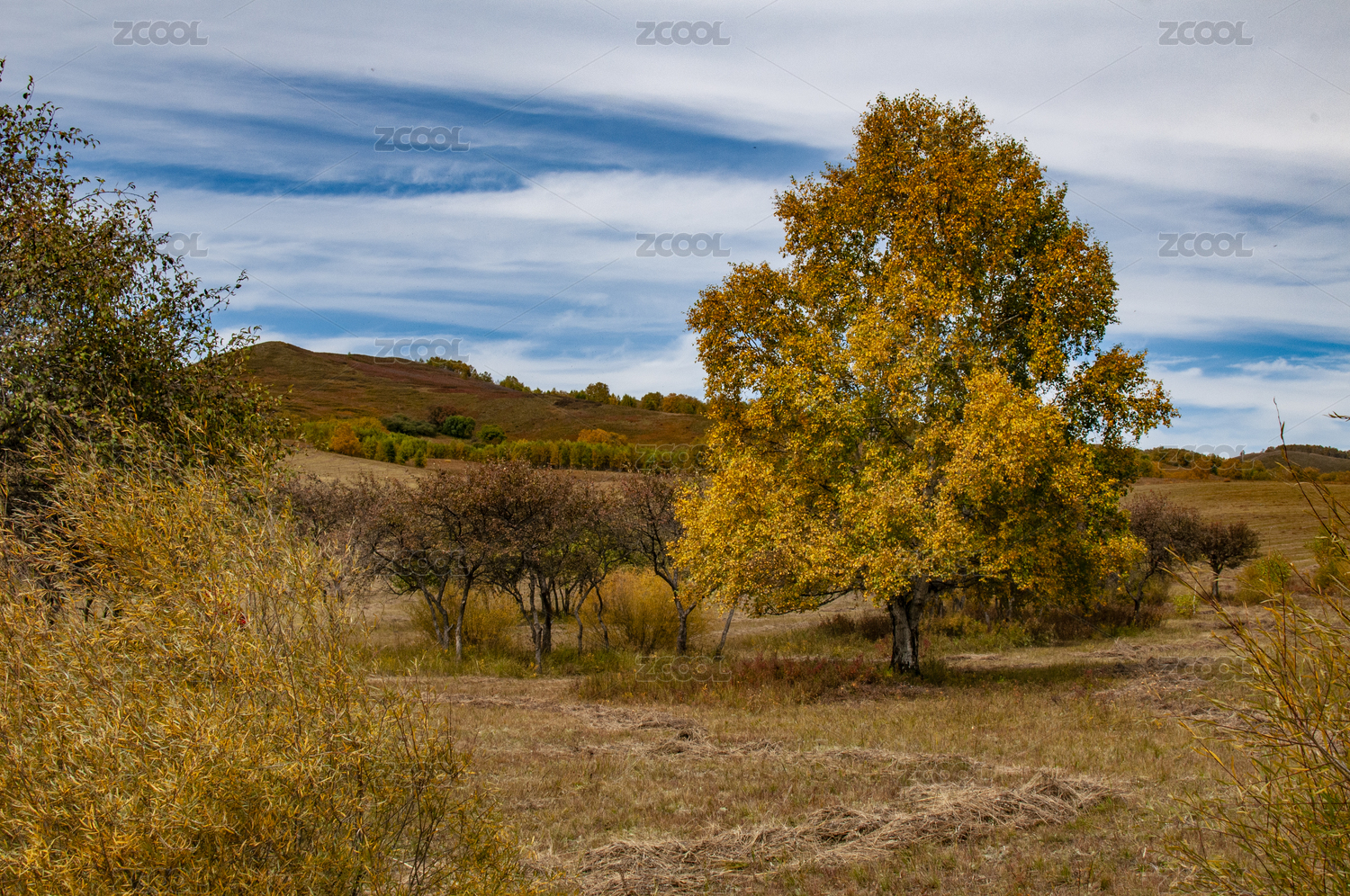 秋天内蒙古乌兰布统坝上草原的沙地和白桦林