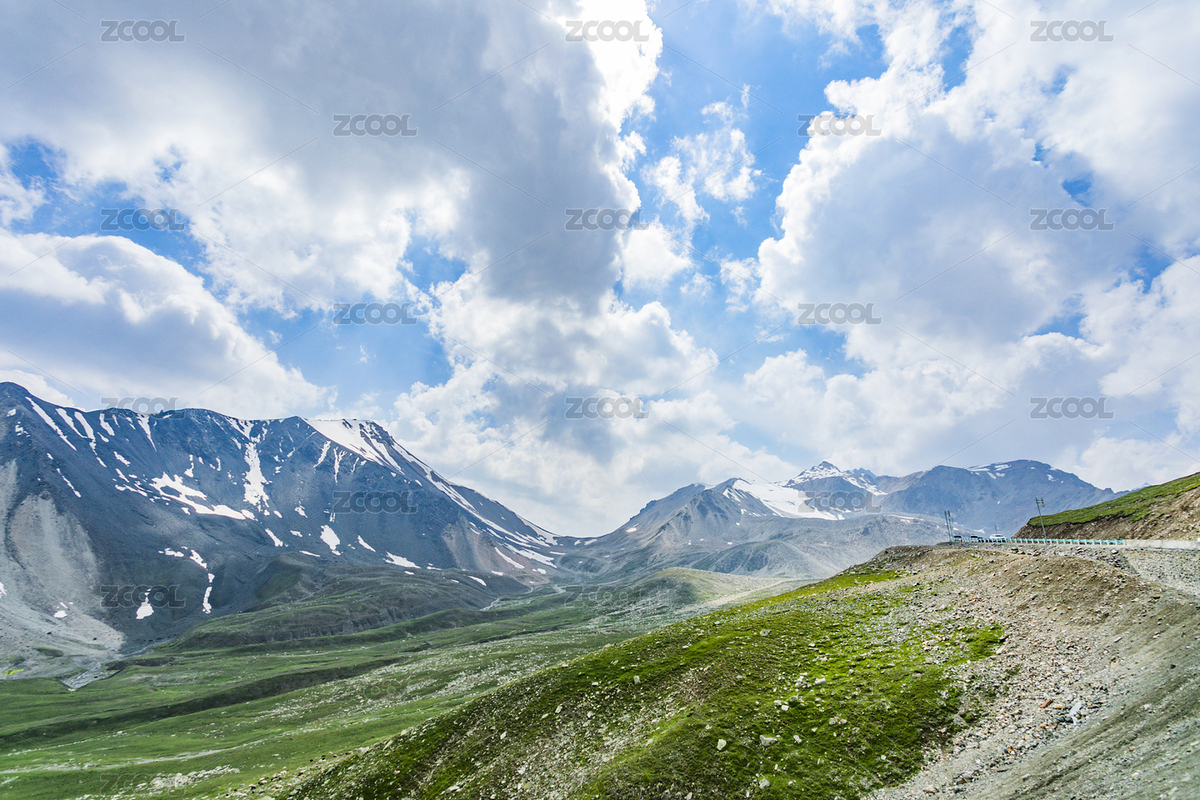 中国新疆夏季蓝天白云下G217独库公路沿途高山草原