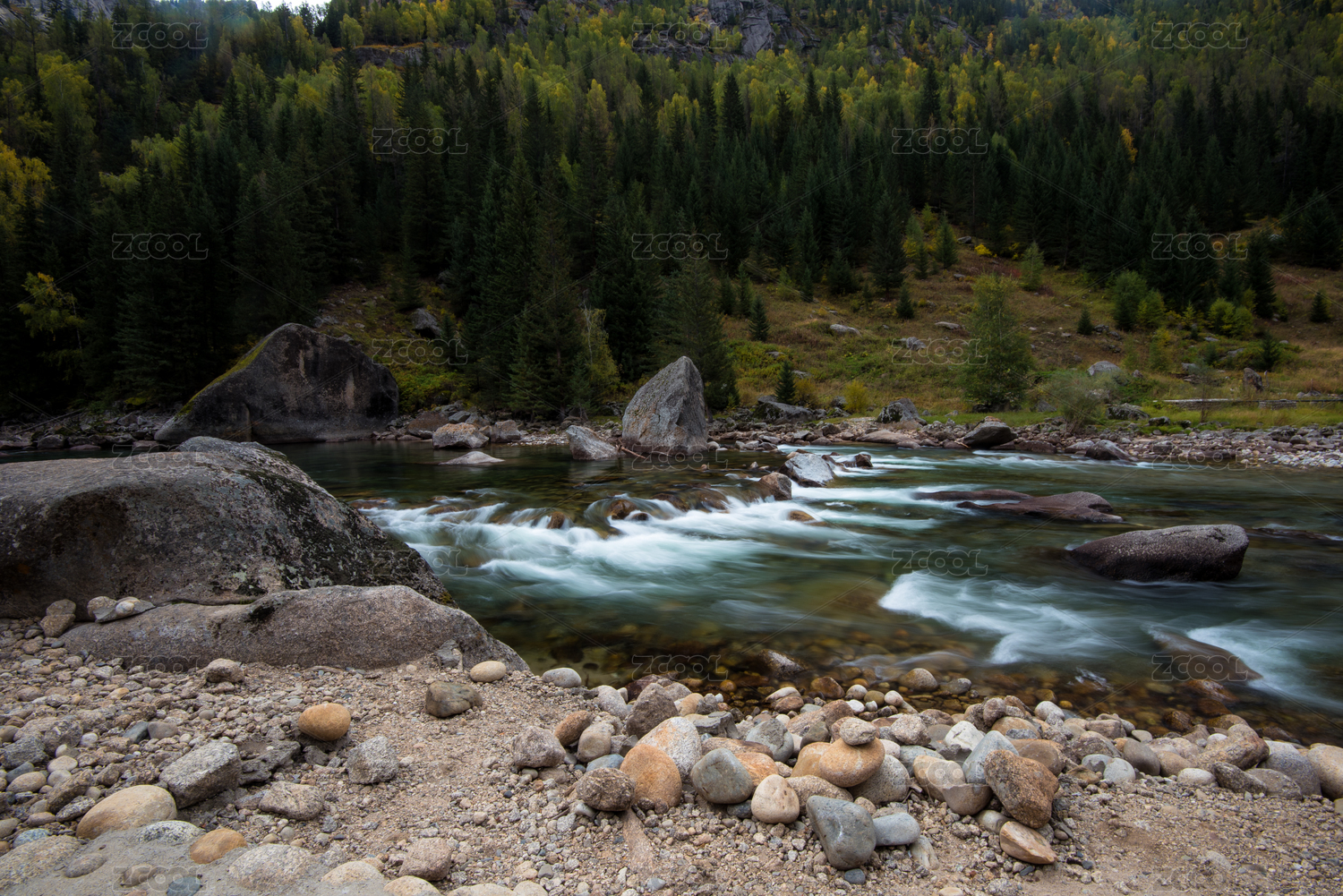 中国新疆可可托海峡谷 怪石散落在绿色河流
