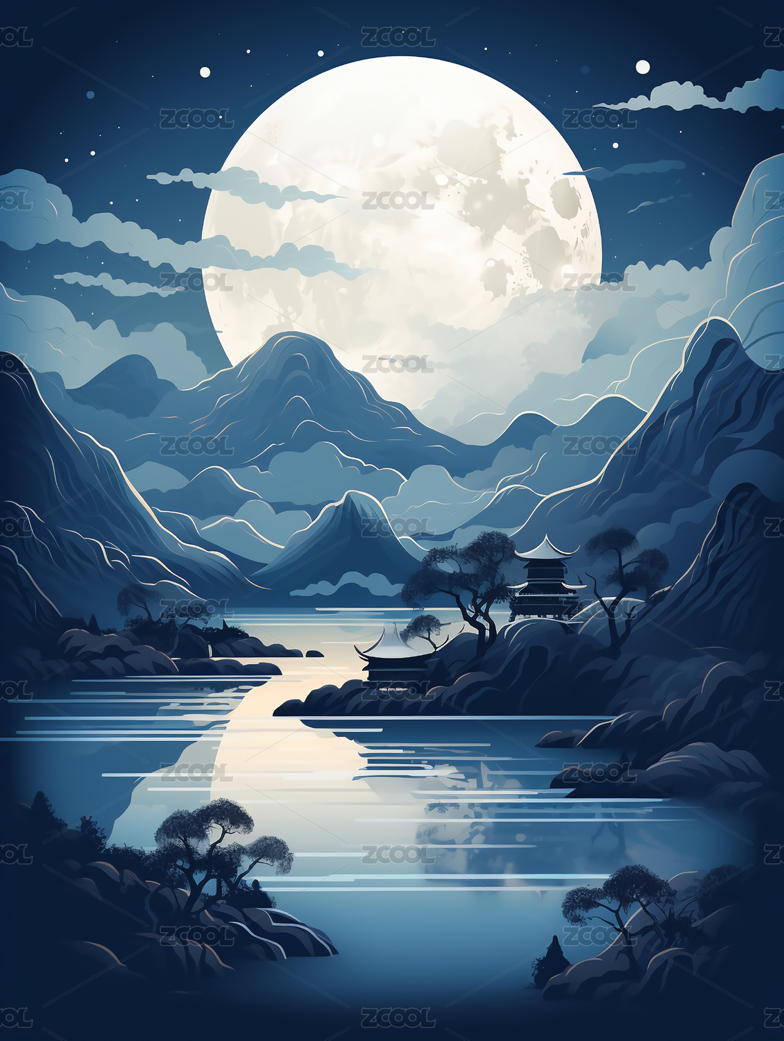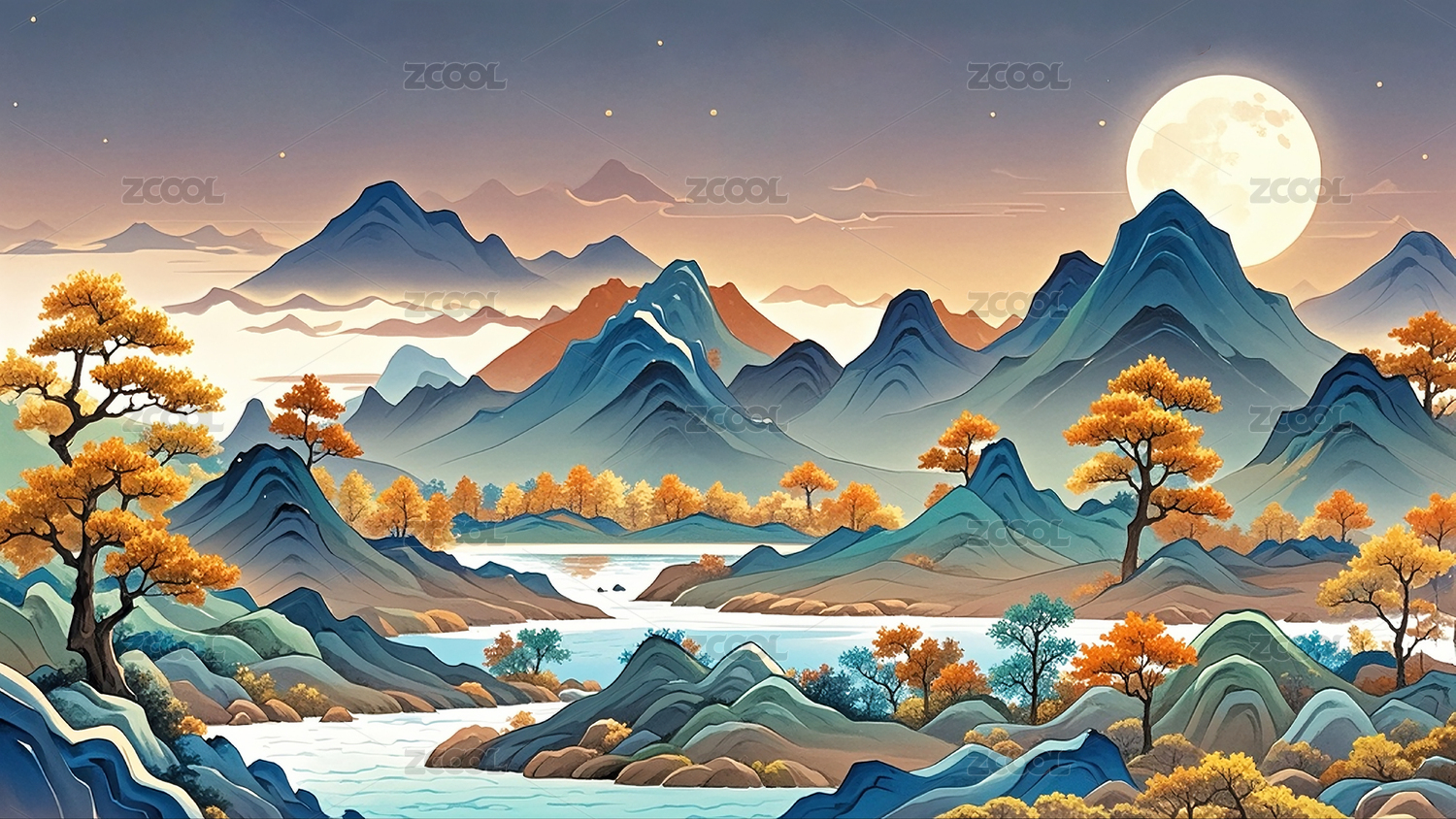 高山,风景,树,自然,背景,蓝色,插画,户外,无人,中国画