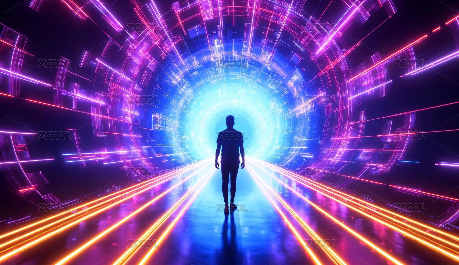 未来隧道中前行的剪影