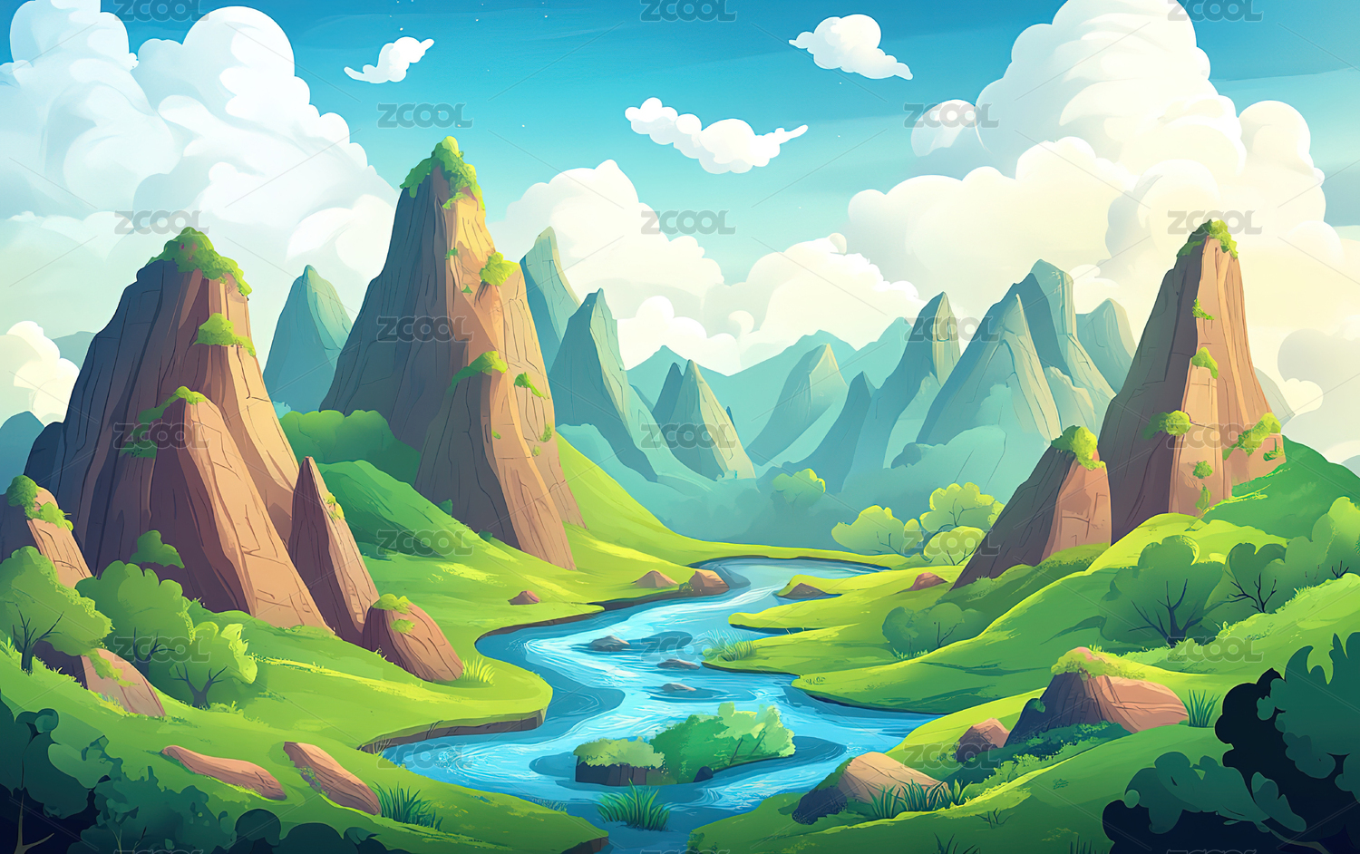 自然,插画,国风,传统,春天,花,绿色,设计,背景,地形
