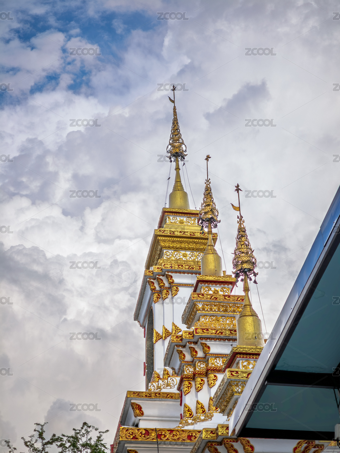 神圣佛教寺庙大门的宁静景象与金色尖顶