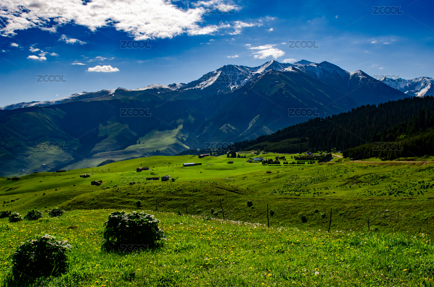 中国新疆伊犁昭苏夏塔草原雪山自然风光