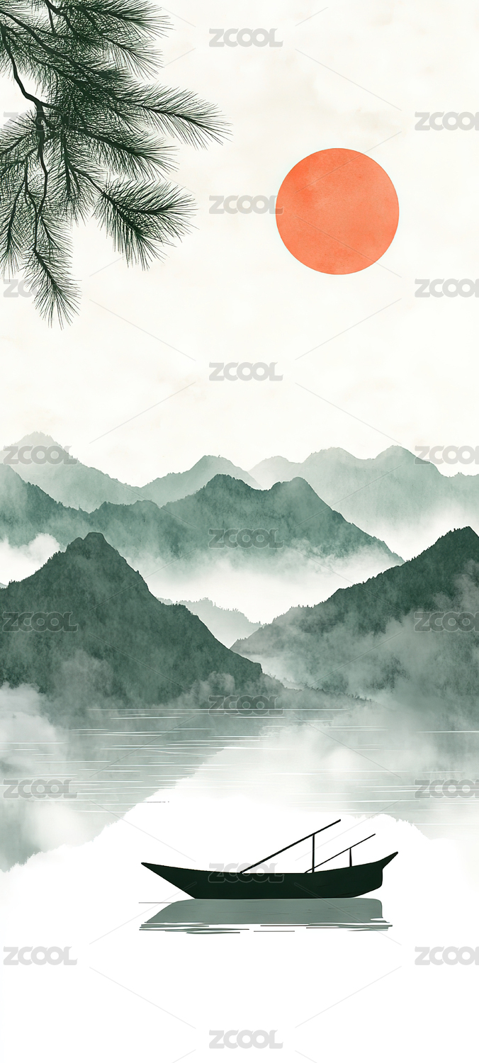 自然,国风,高山,无人,中国画,插画,鸟类,船