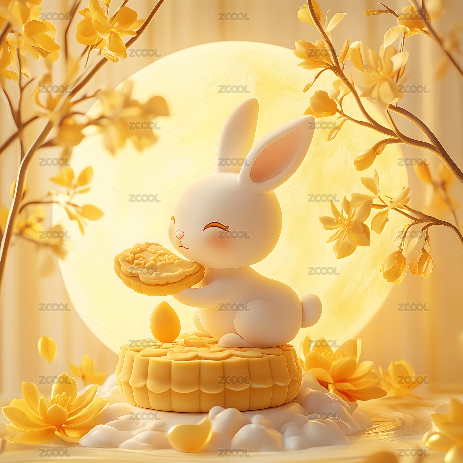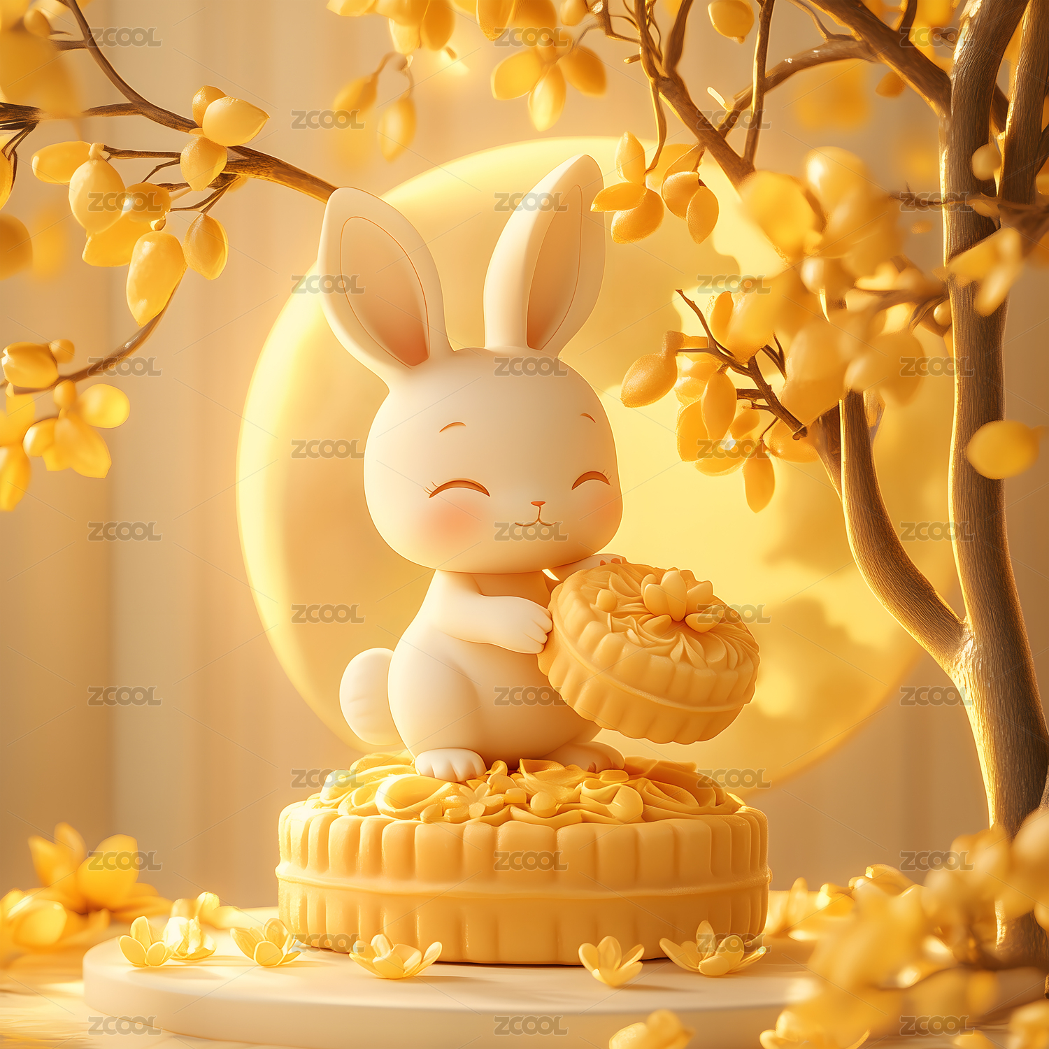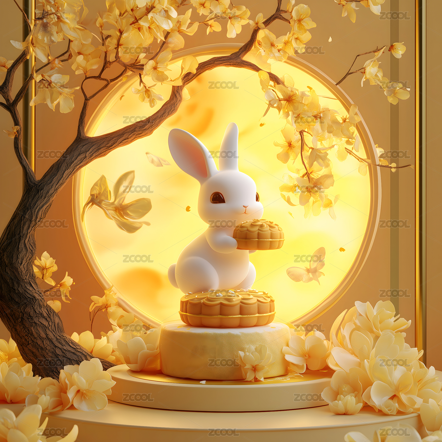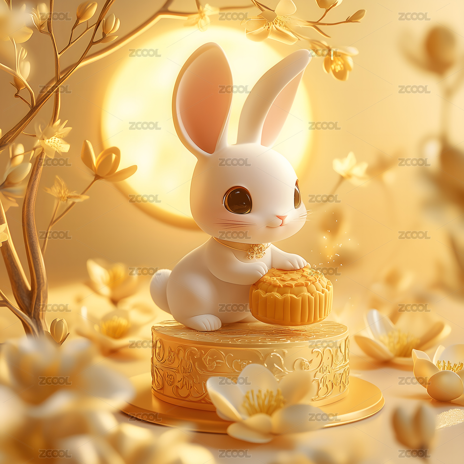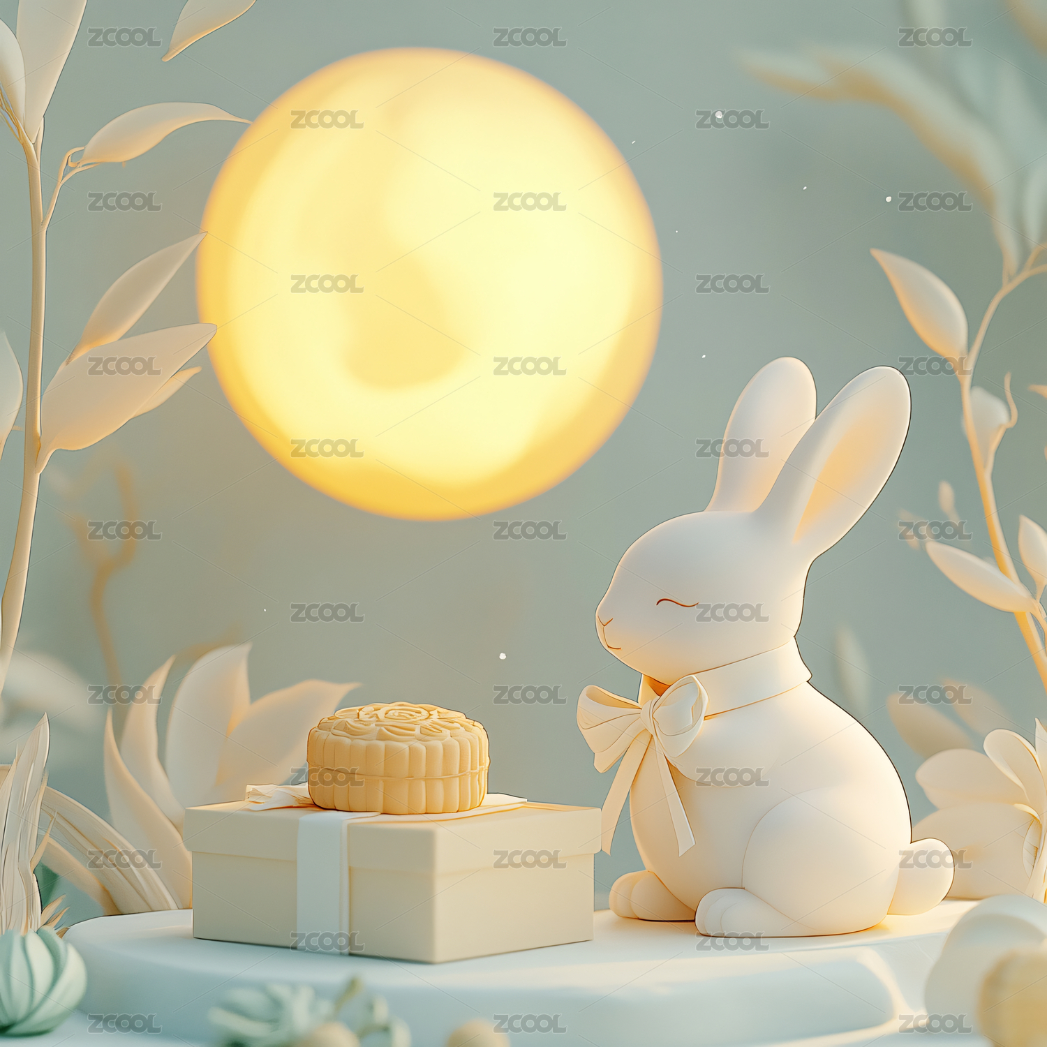 中秋节,兔子,月饼,3D兔子,3D,场景,插画,玉兔,白兔,卡通兔子