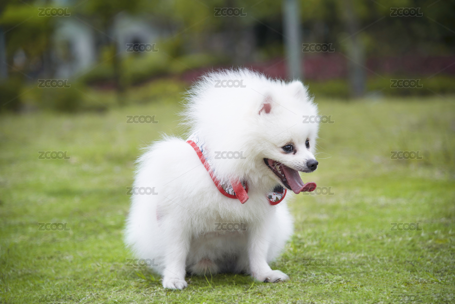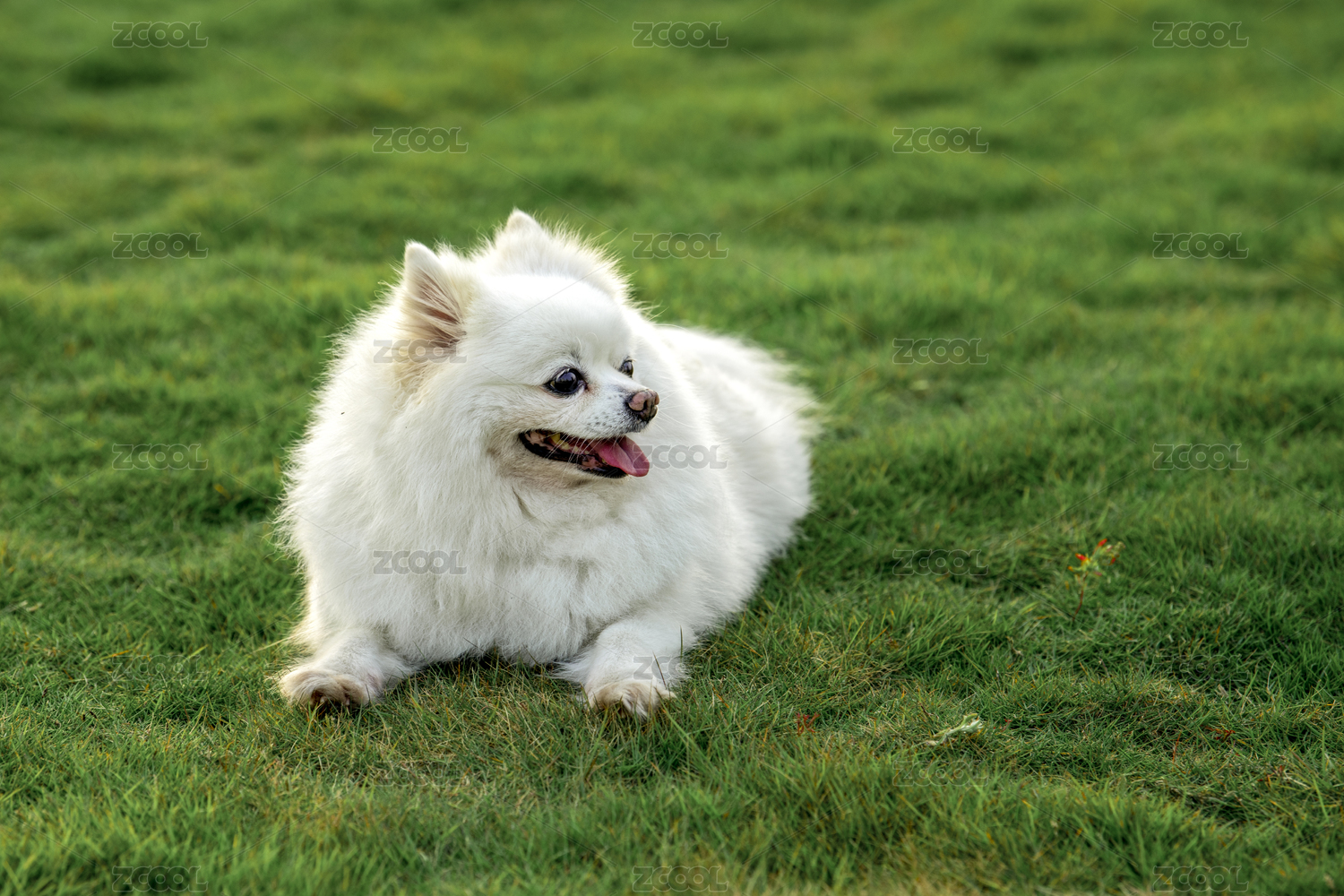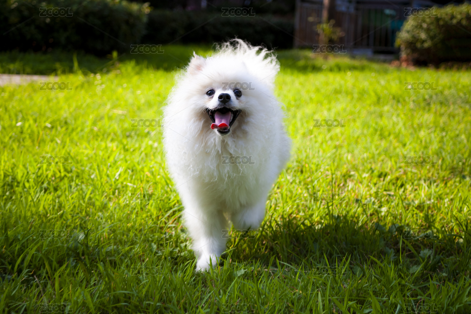 一只白色的博美犬从草坪深处走过来
