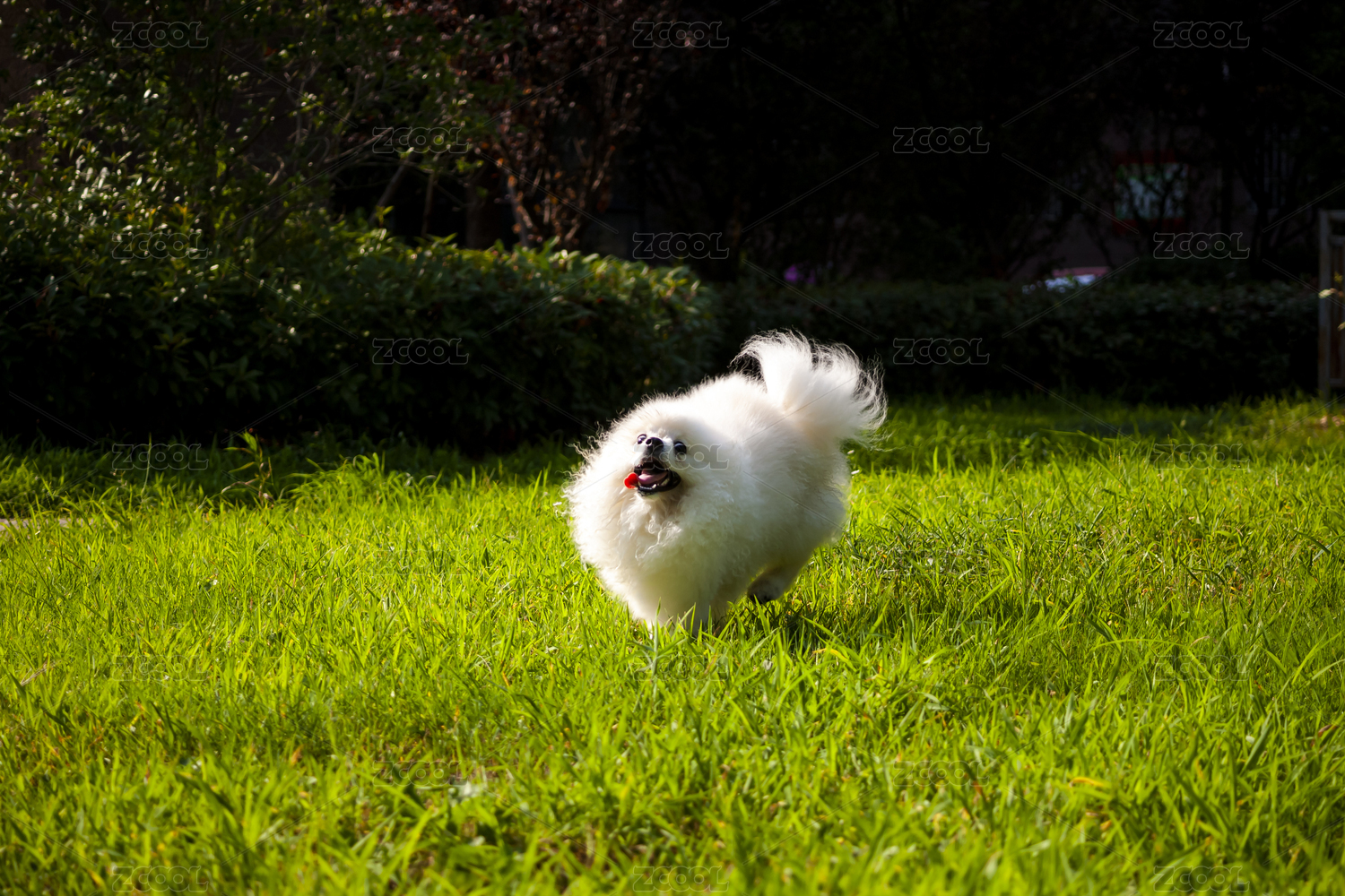 在草地上奔跑的白色博美犬