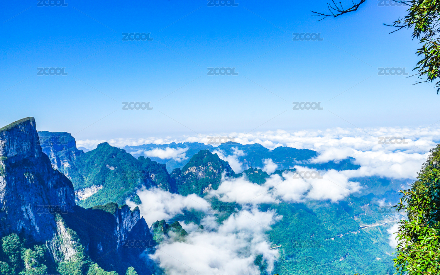 秋日蓝天下的中国湖南张家界天门山景区连绵起伏雄伟的崇山峻岭