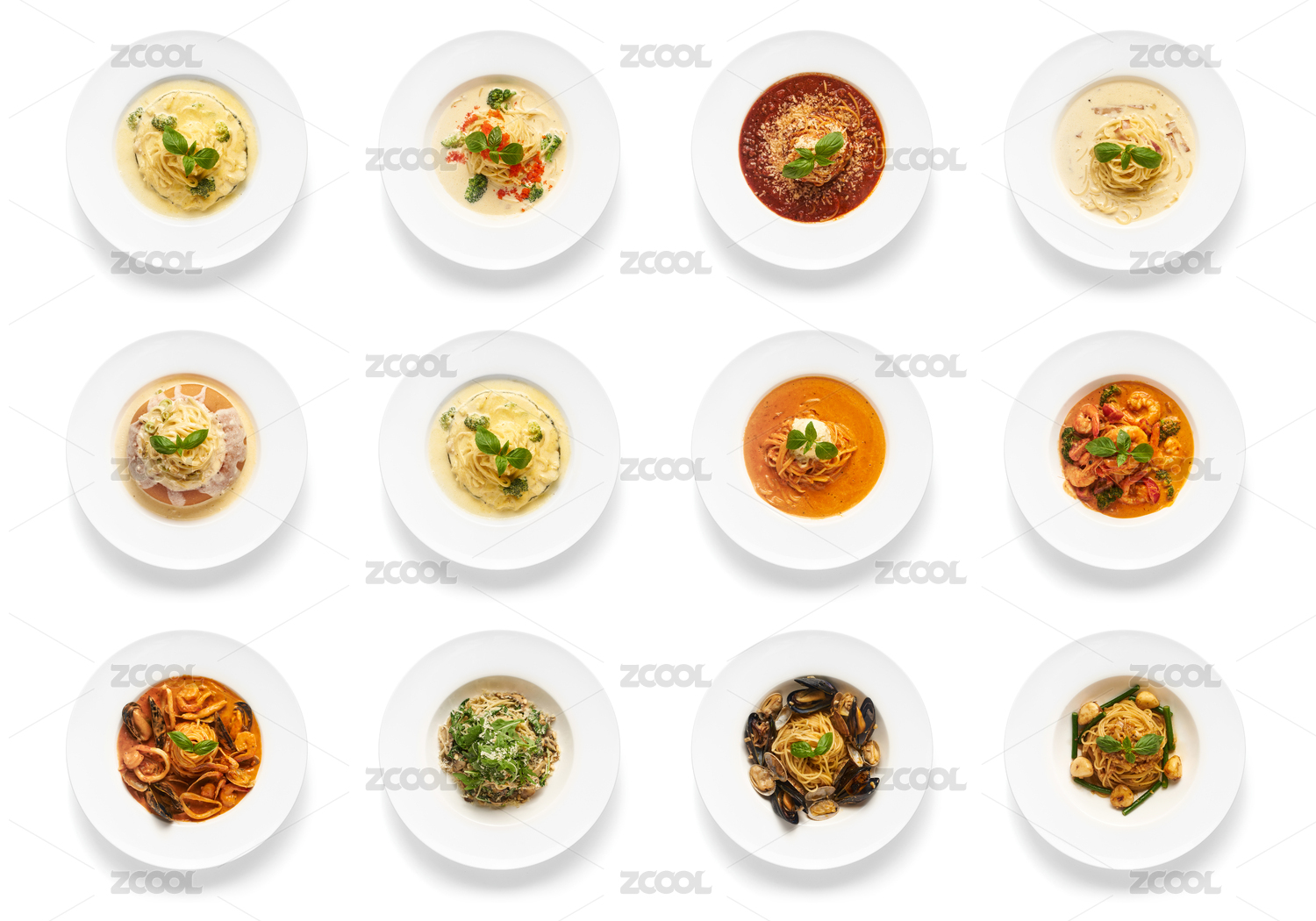 白色背景上的意大利面组合