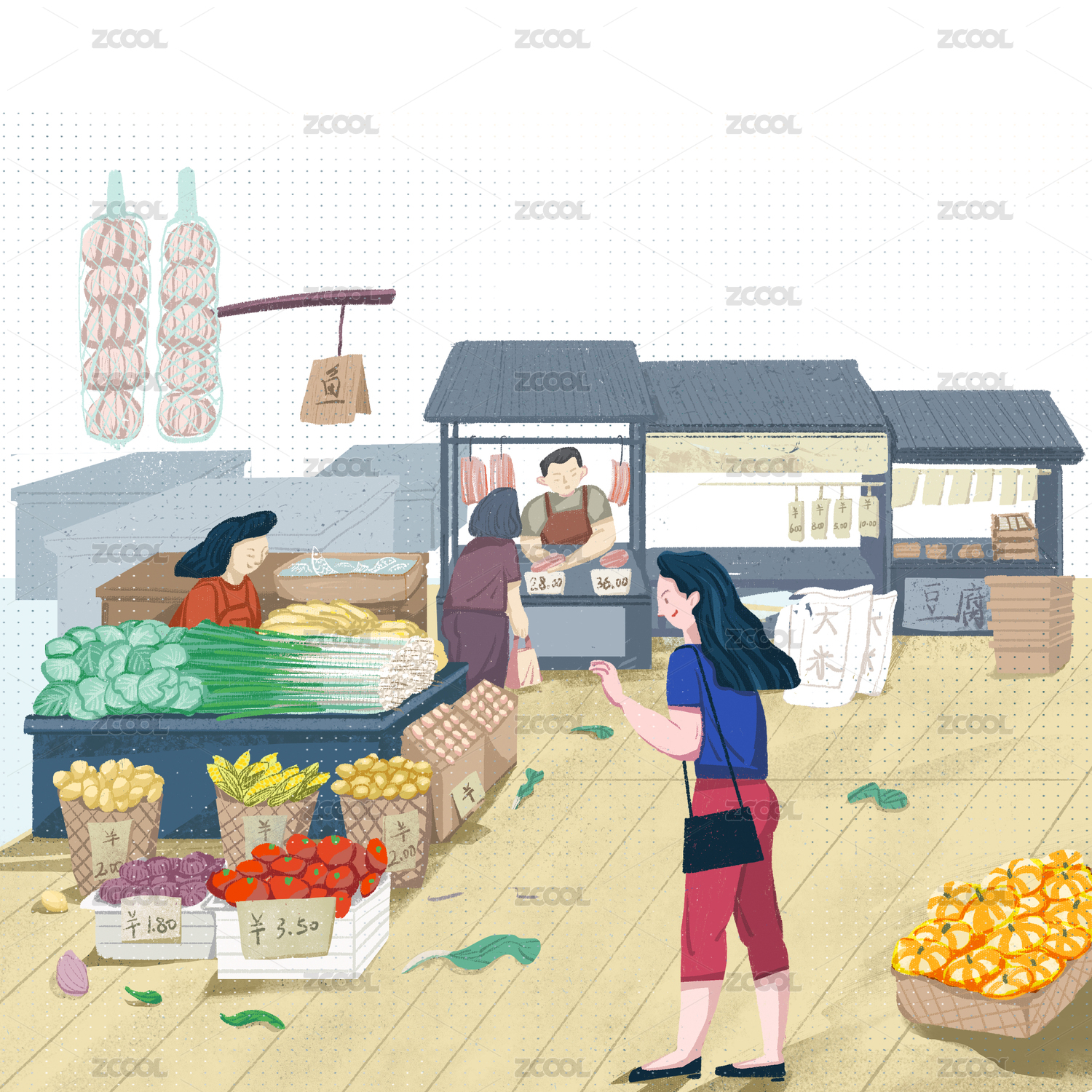 热闹赶集市菜市场摆摊卖买菜买卖水果市集