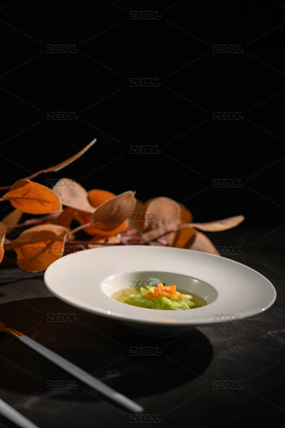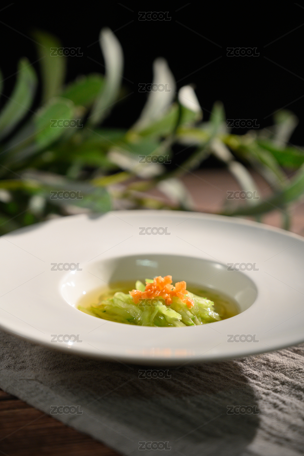 白盘里的素食料理香辣黄瓜牛肉紫苏卷