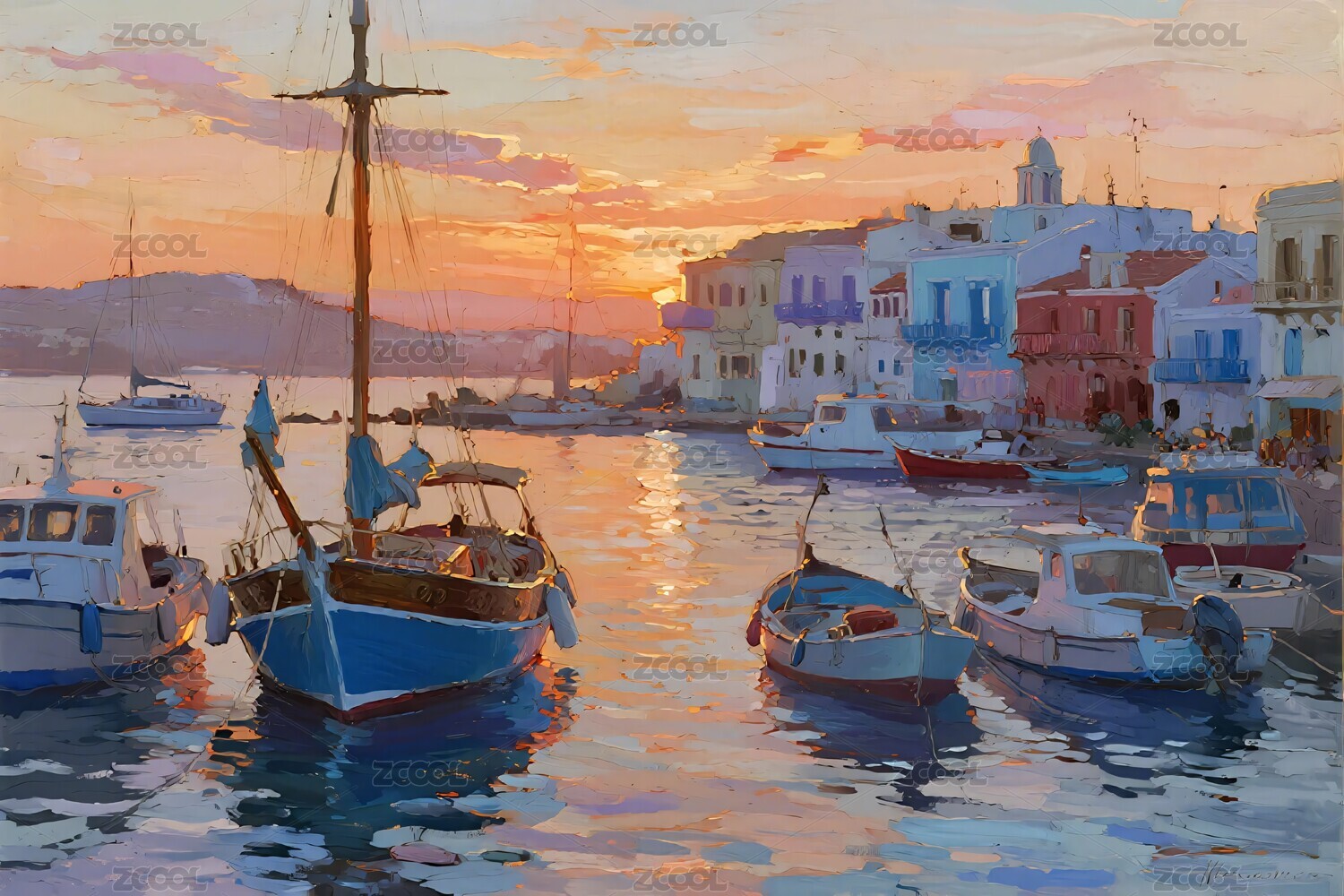 雨天的地中海沿海村庄风景油画抽象装饰画