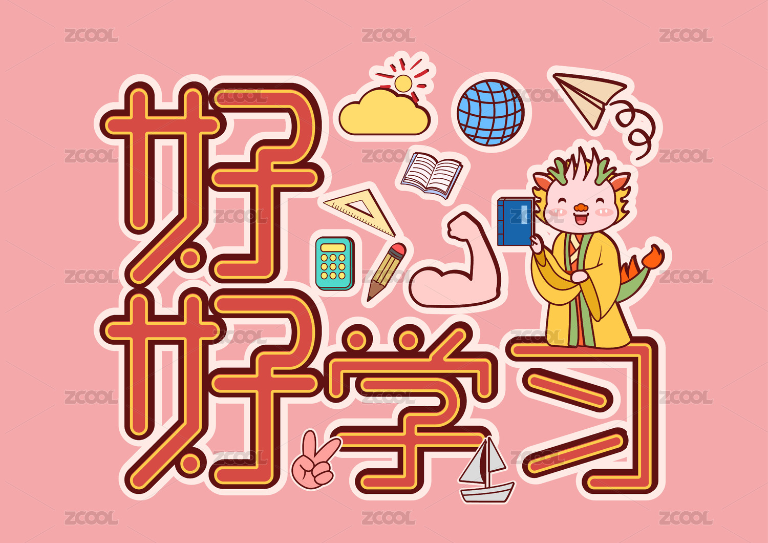 小龙和好好学习文字组尺子笔和书矢量插画