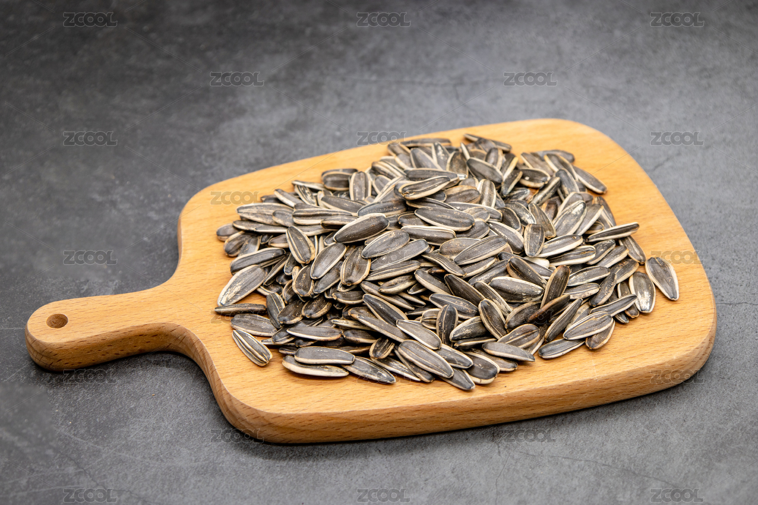 木制桌面上一盘原味葵花籽和周围散落的瓜子