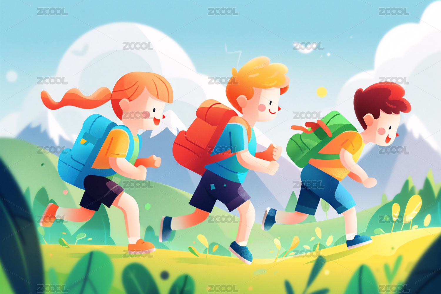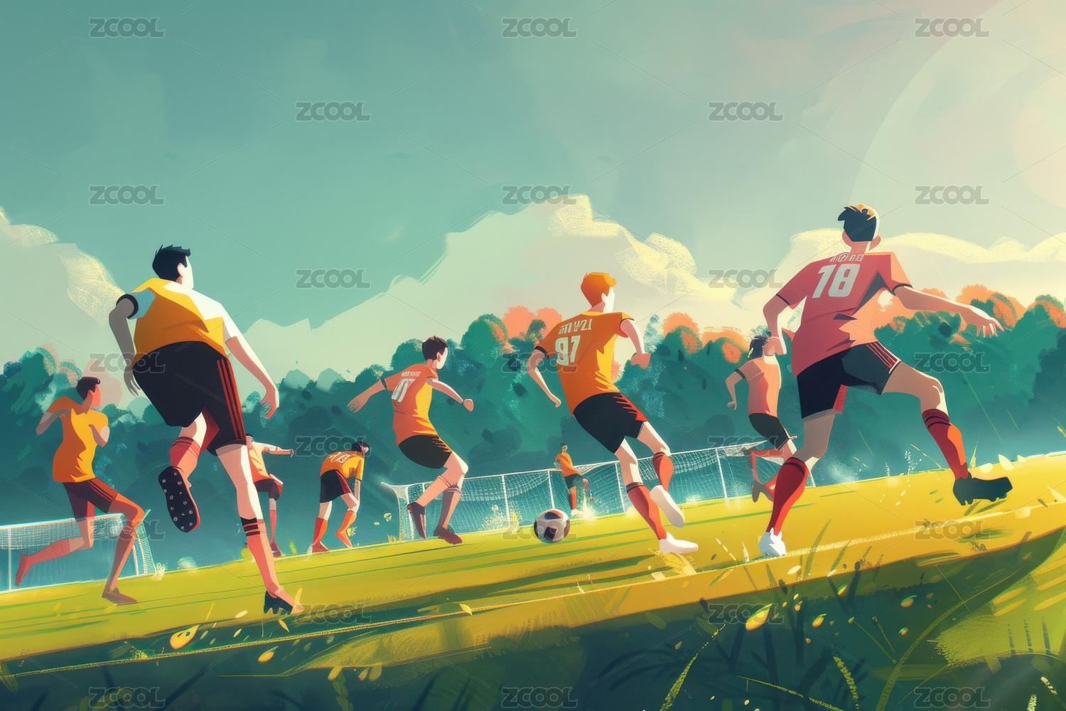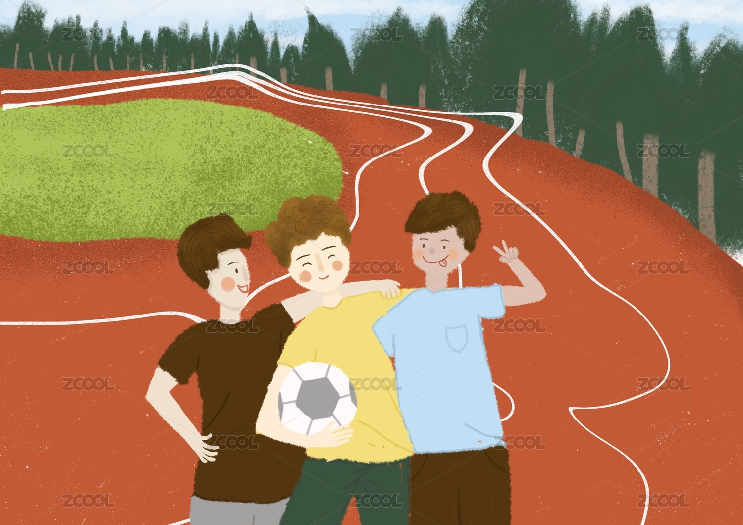 在田间丛林奔跑踢足球的儿童卡通背景插画