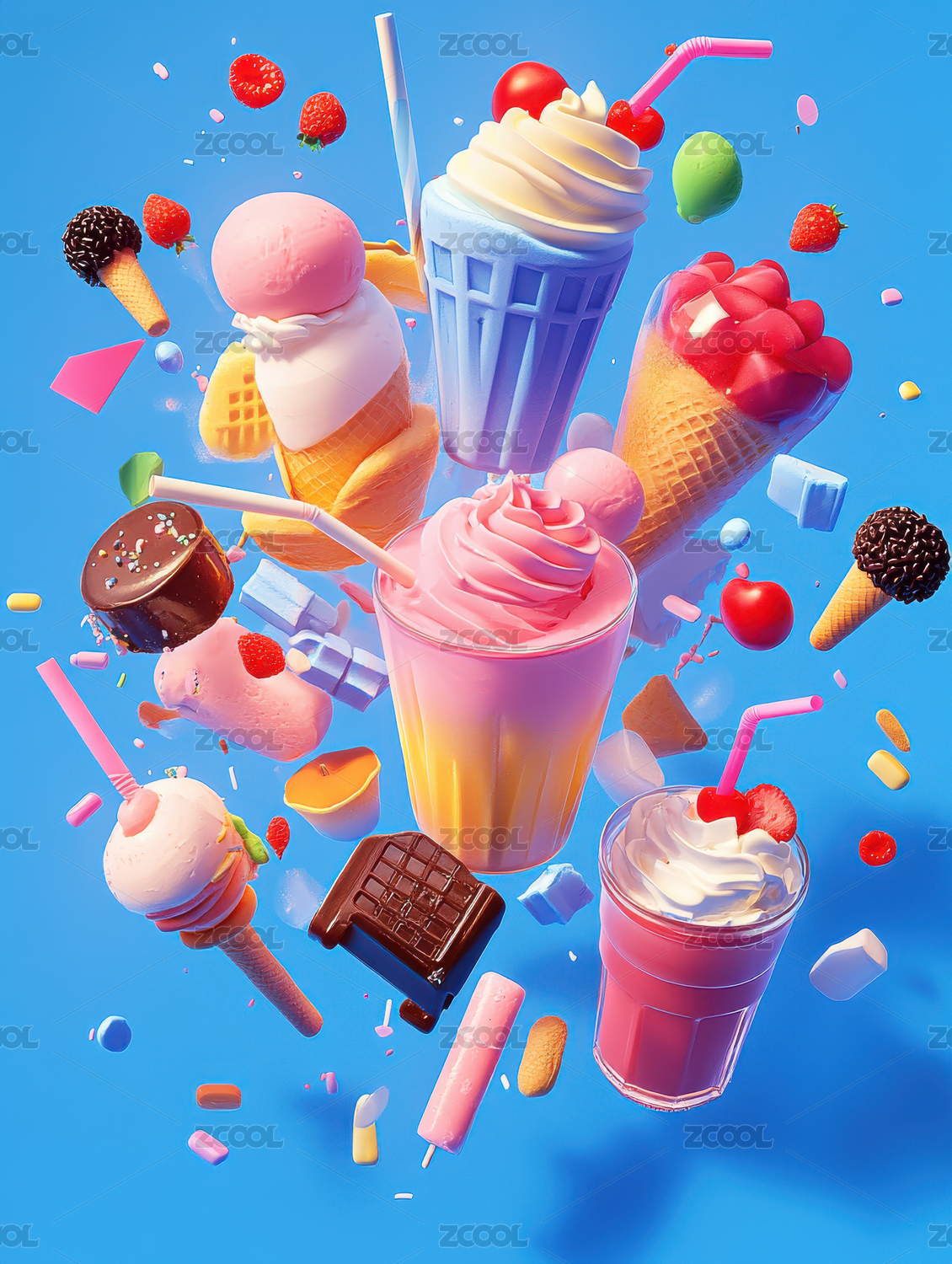 色彩鲜艳的漂浮飞溅水果冰淇凌3D插画