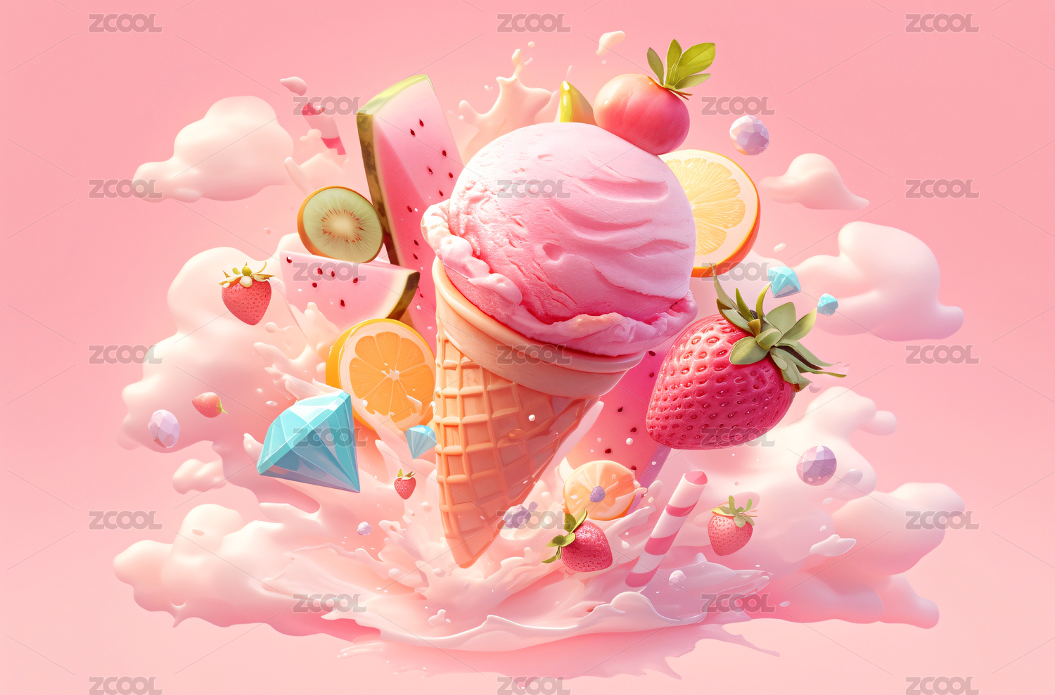 色彩鲜艳的漂浮飞溅的水果冰淇凌3D插画