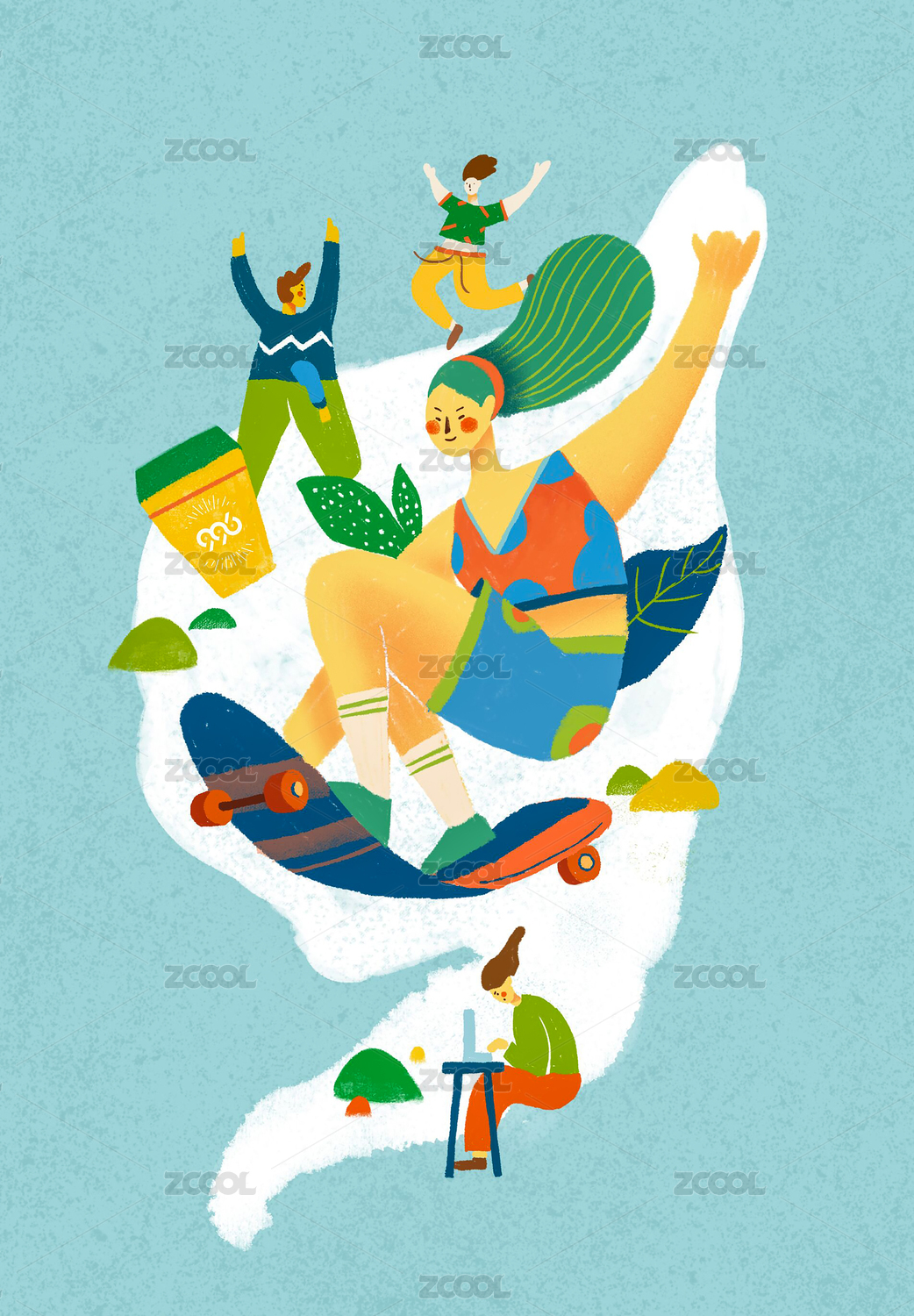 女孩玩滑板喝咖啡插画