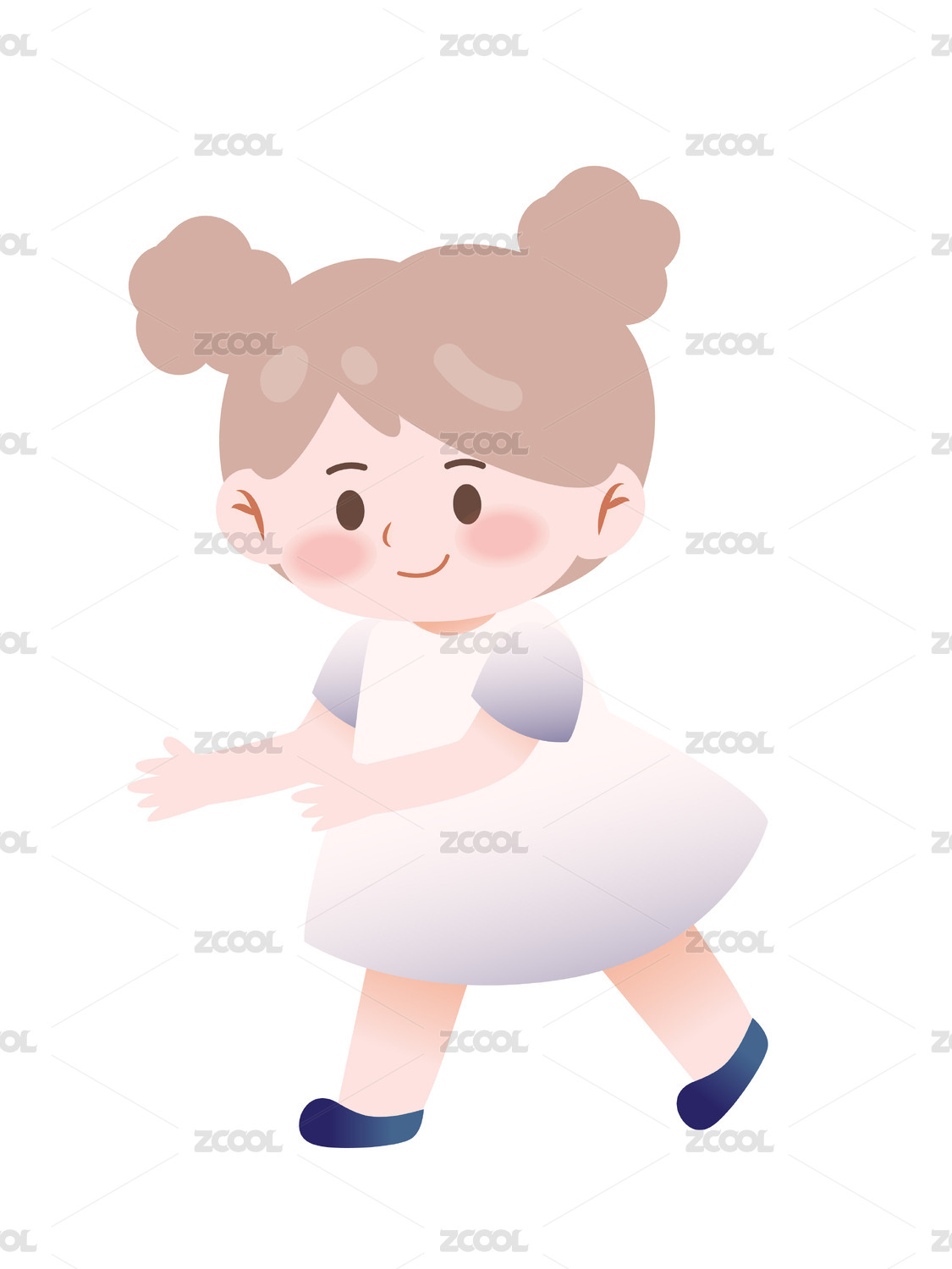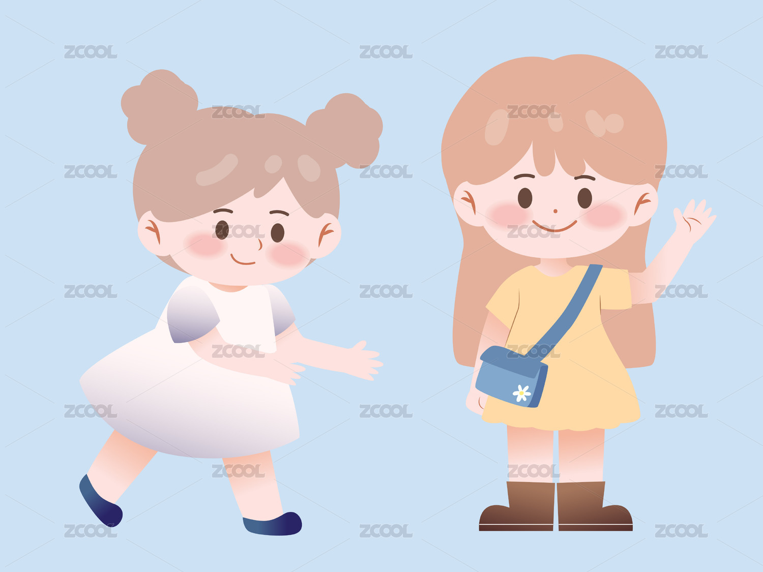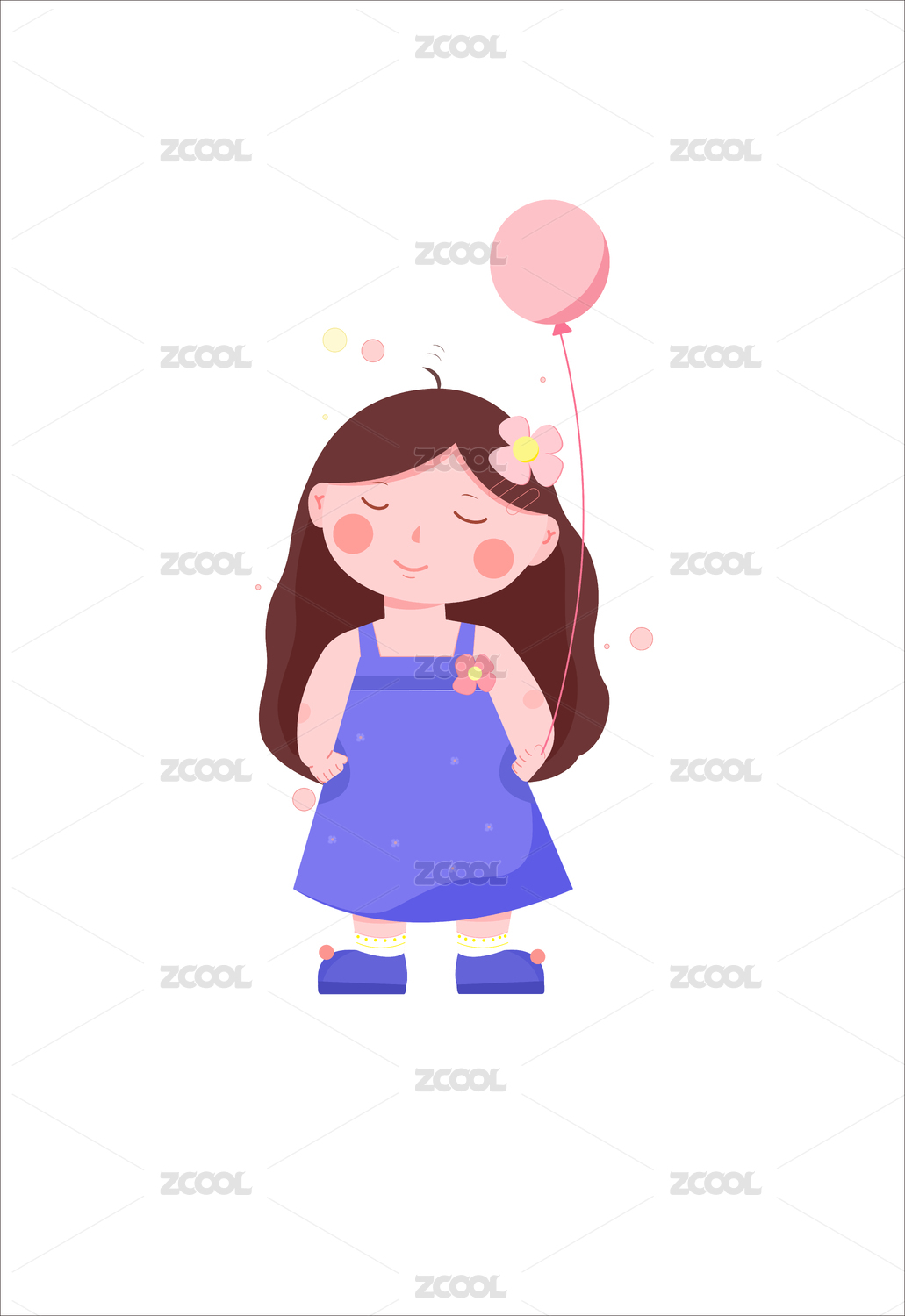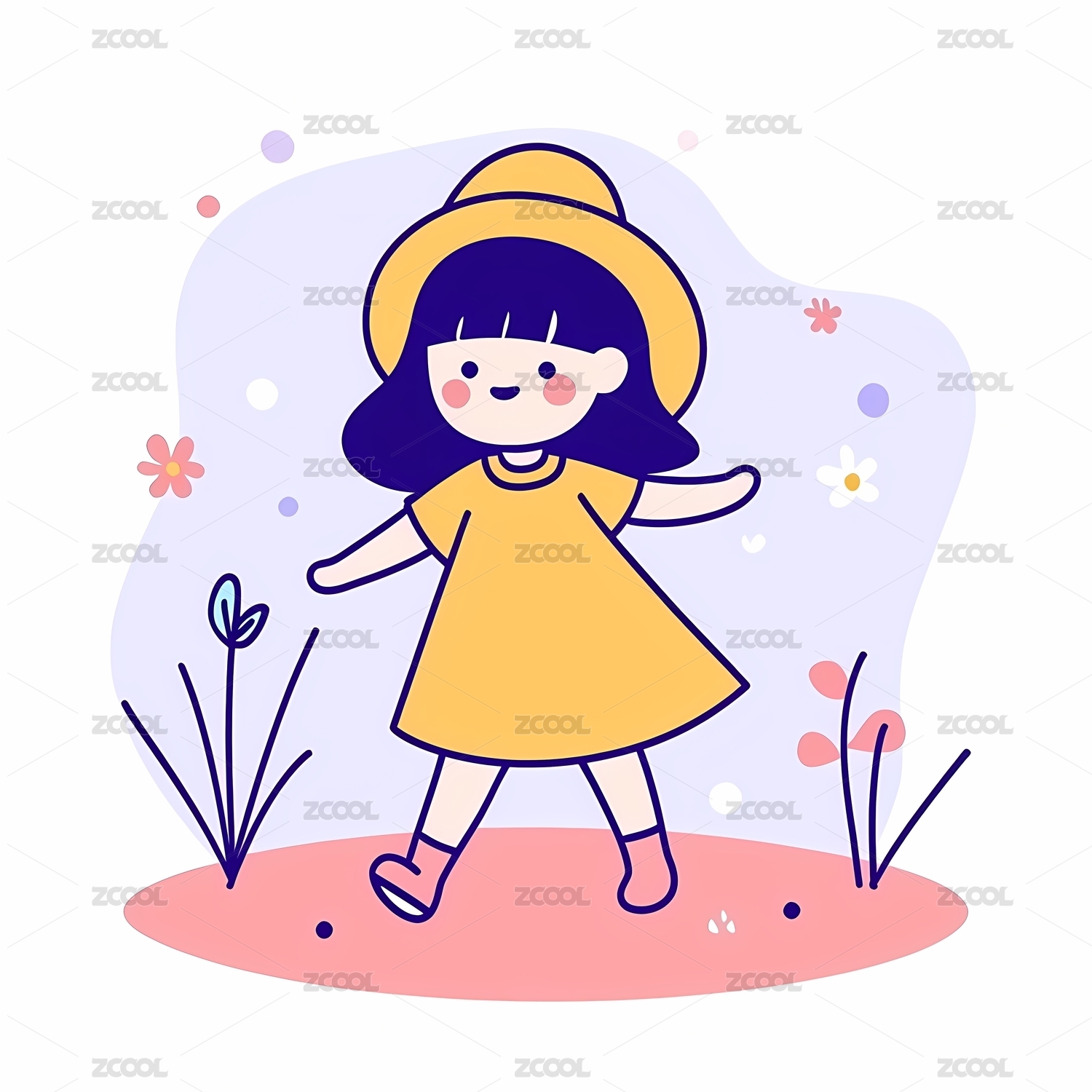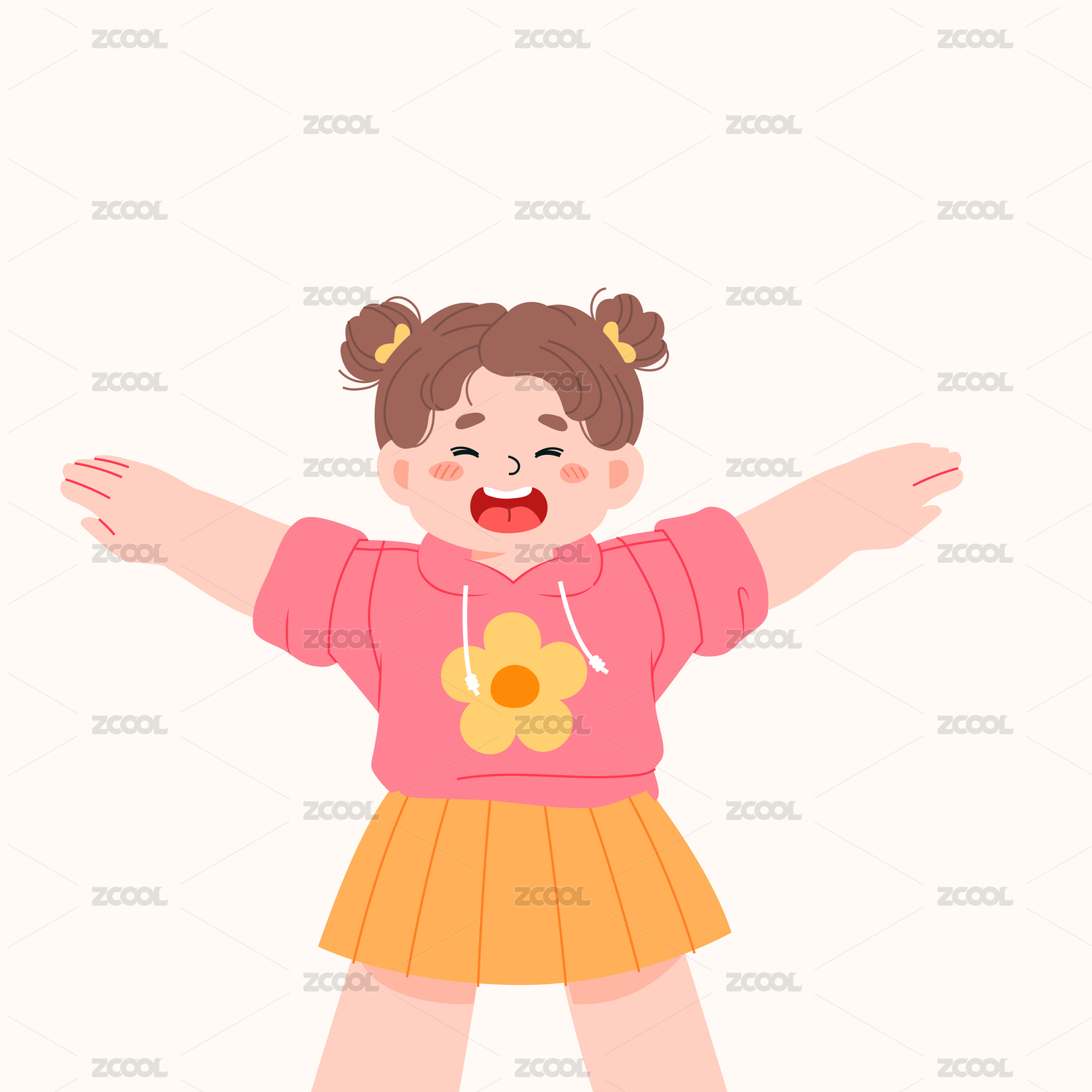 手绘Q版卡通穿背带裤抱书开心站立女孩插画