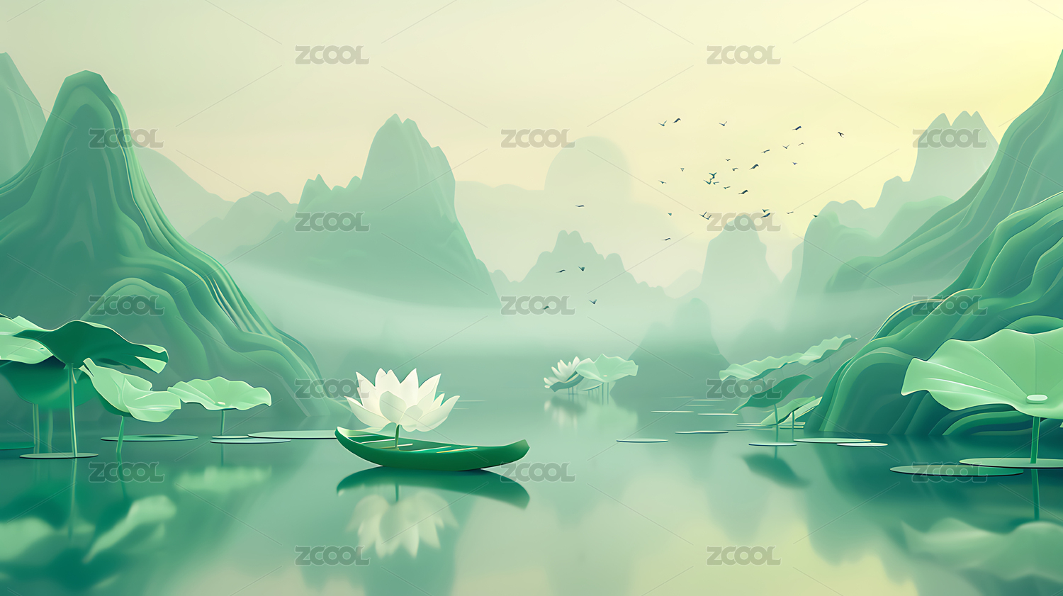 山水,卡通,峡谷,山谷,溪流,高山,植被,划船