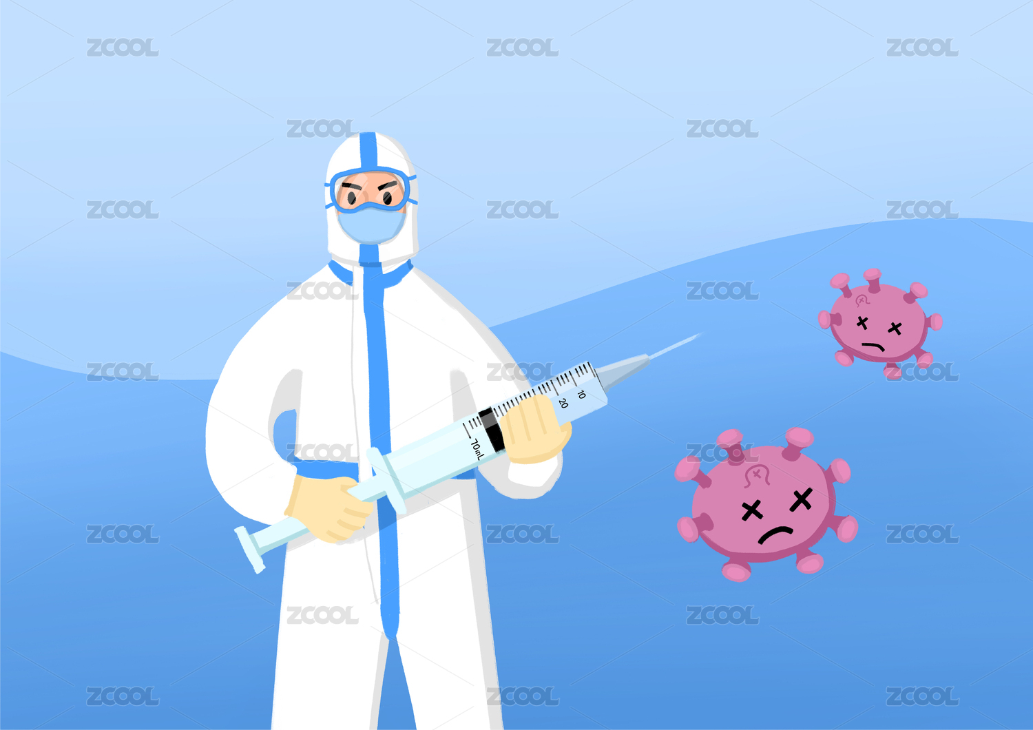 防疫人员身穿防护服用疫苗和消杀抗击新冠