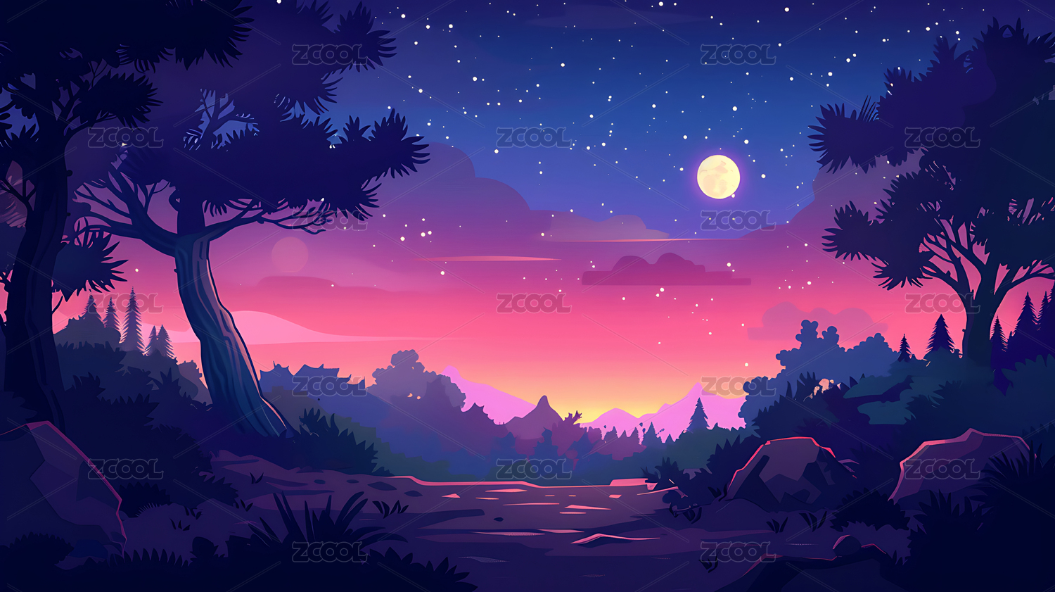 紫色山峦星月夜空